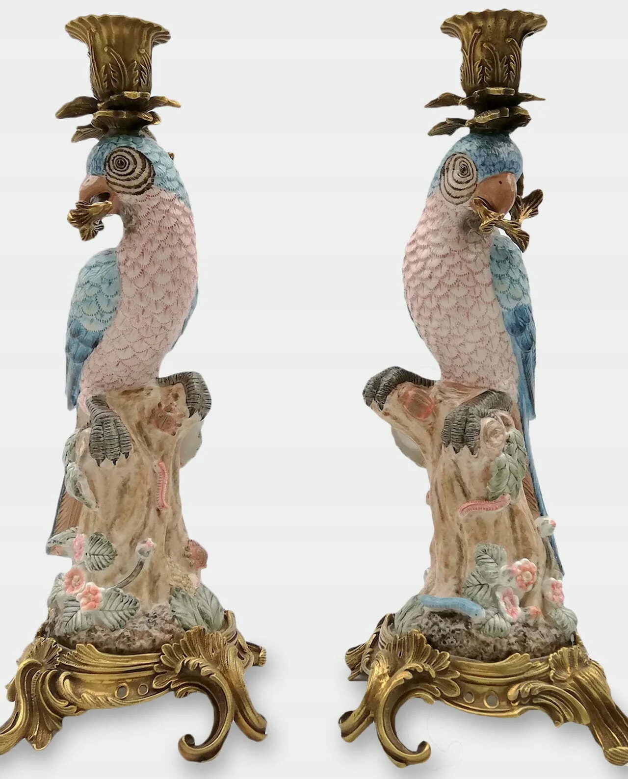Уникальный набор из двух фарфоровых подсвечников в форме попугай. Красивые, реалистично окрашенные, синие попугаи, сидящие на пнях. Изготовлен из эксклюзивных материалов - фарфорового и бронзы, очень точно, с вниманием к наименьшим деталям. Они производят огромное эстетическое впечатление и имеют вечный стиль. Подходят для многих интерьеров.