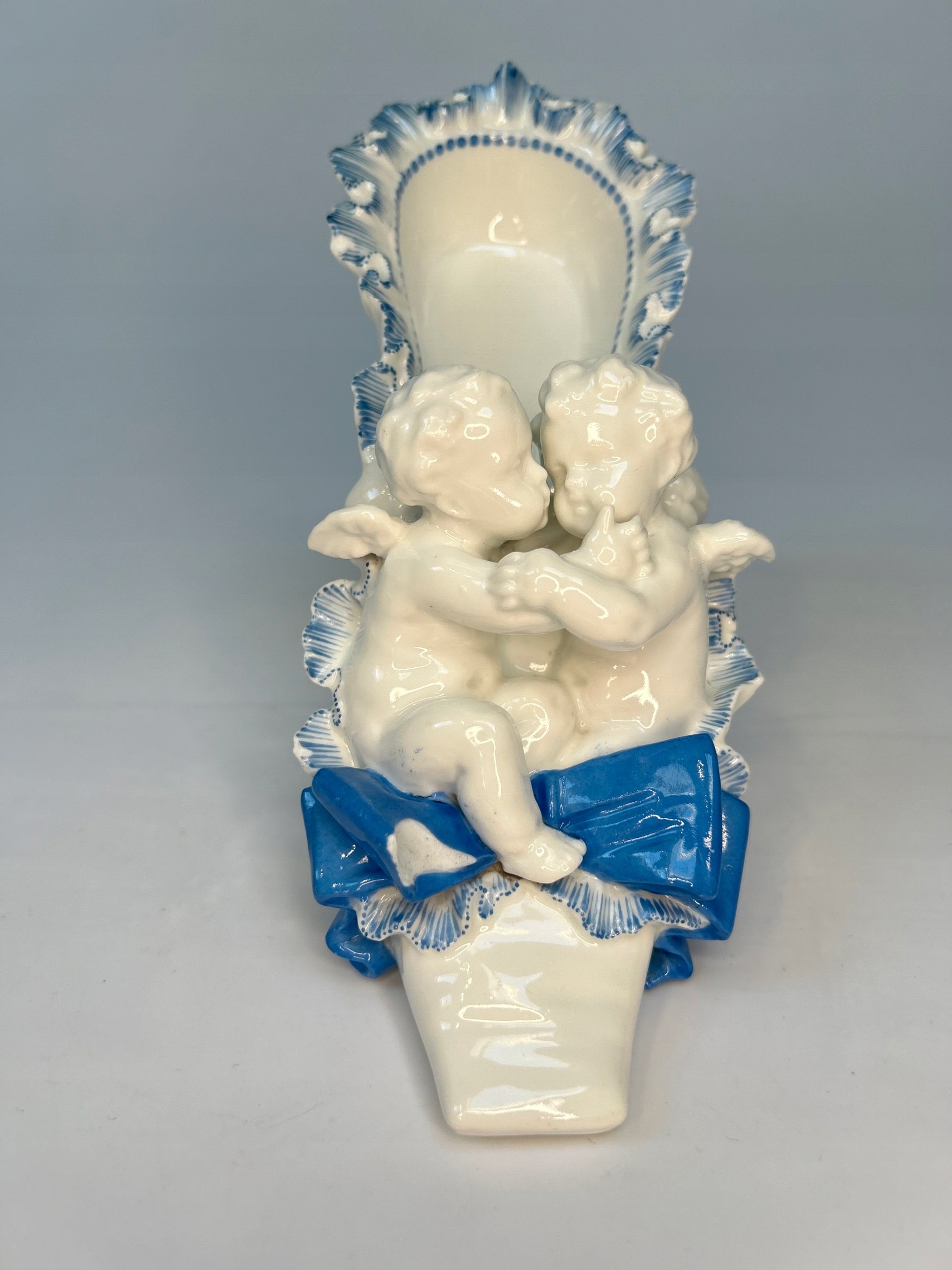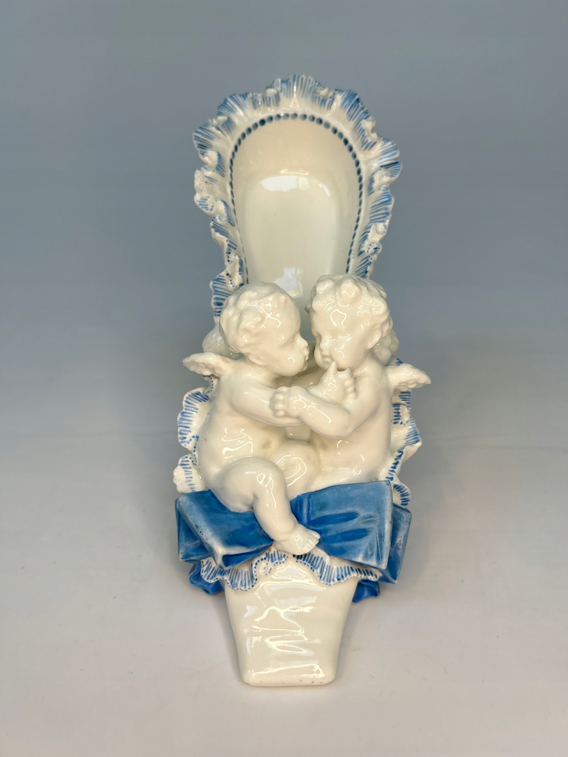 Представляю вам уникальные фарфоровые тапочки, в которых сидят милые херувимы. Тапочки украшены синими бантиками и синей рюшой.