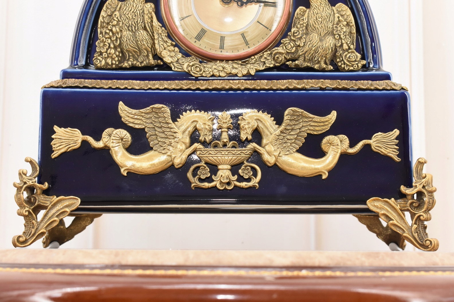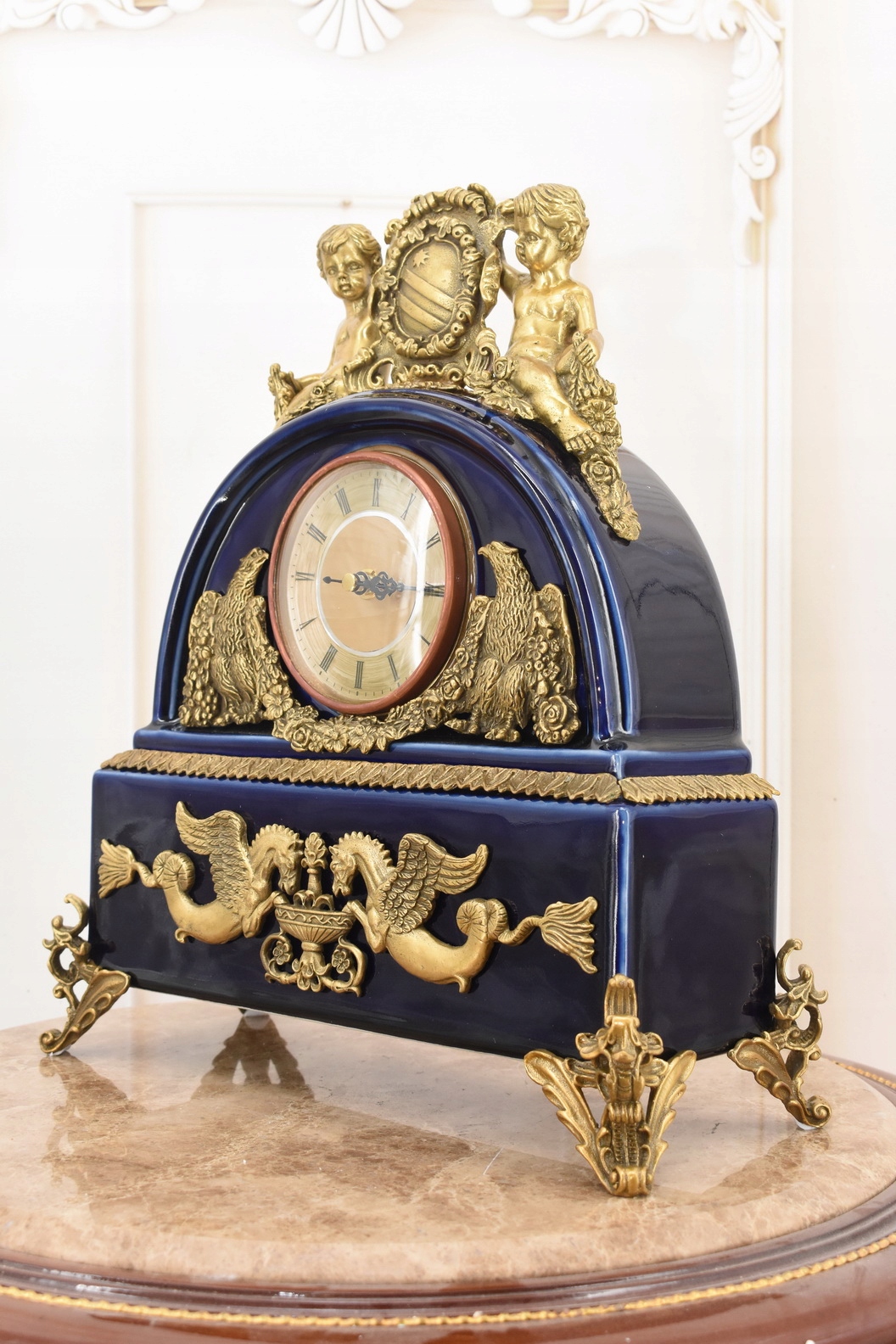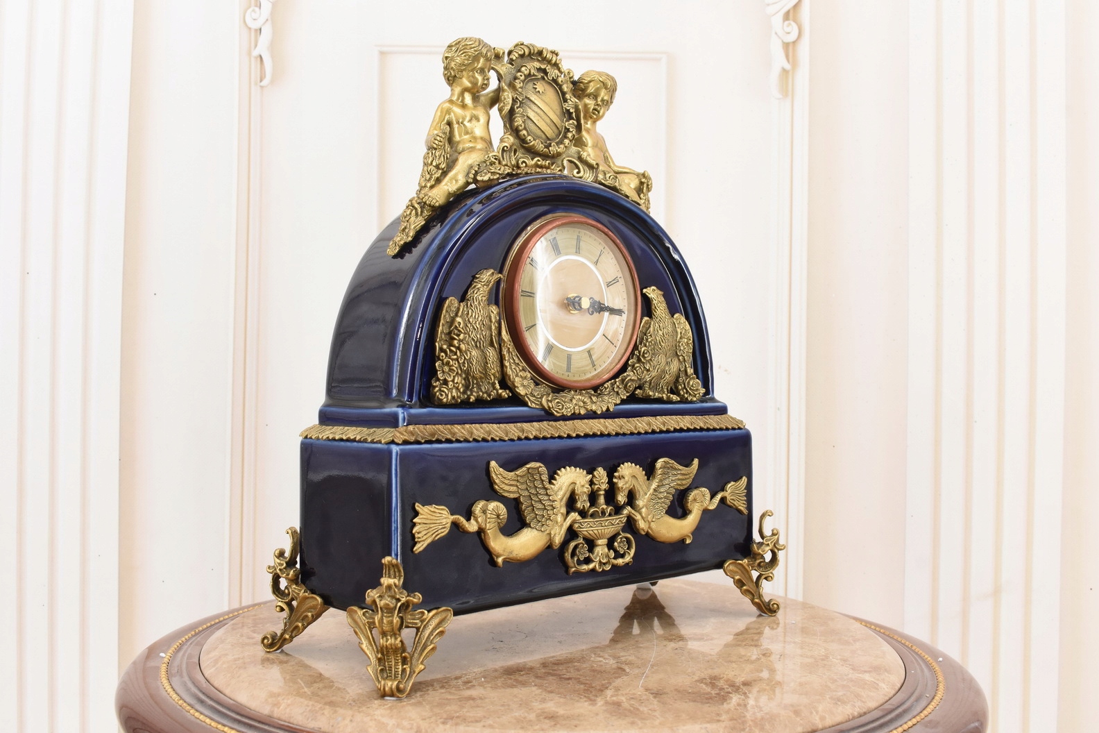 Кобальтовые фарфоровые часы - богато украшенные - фарфор + камин коричневый