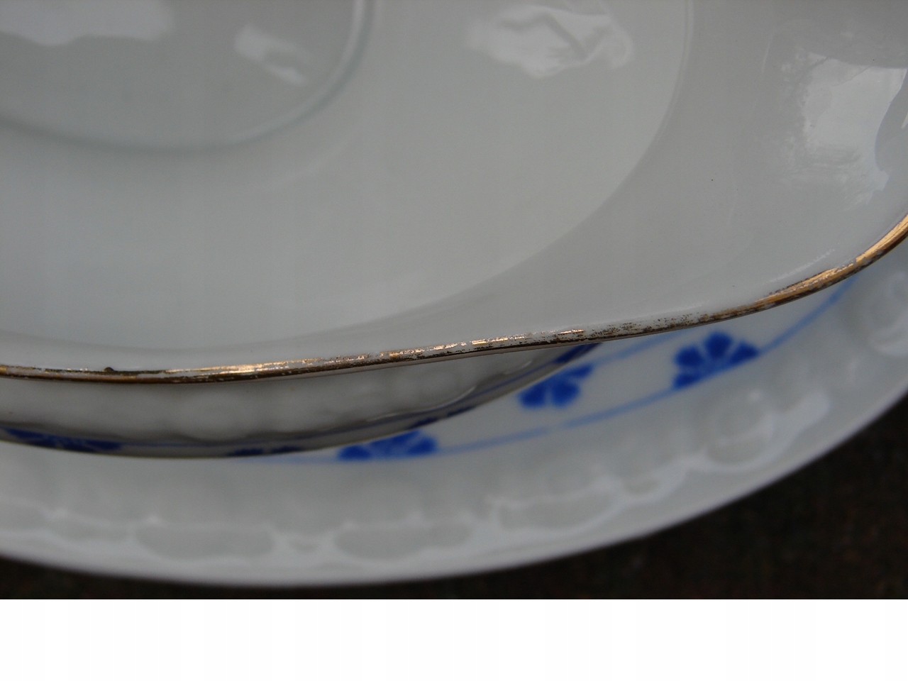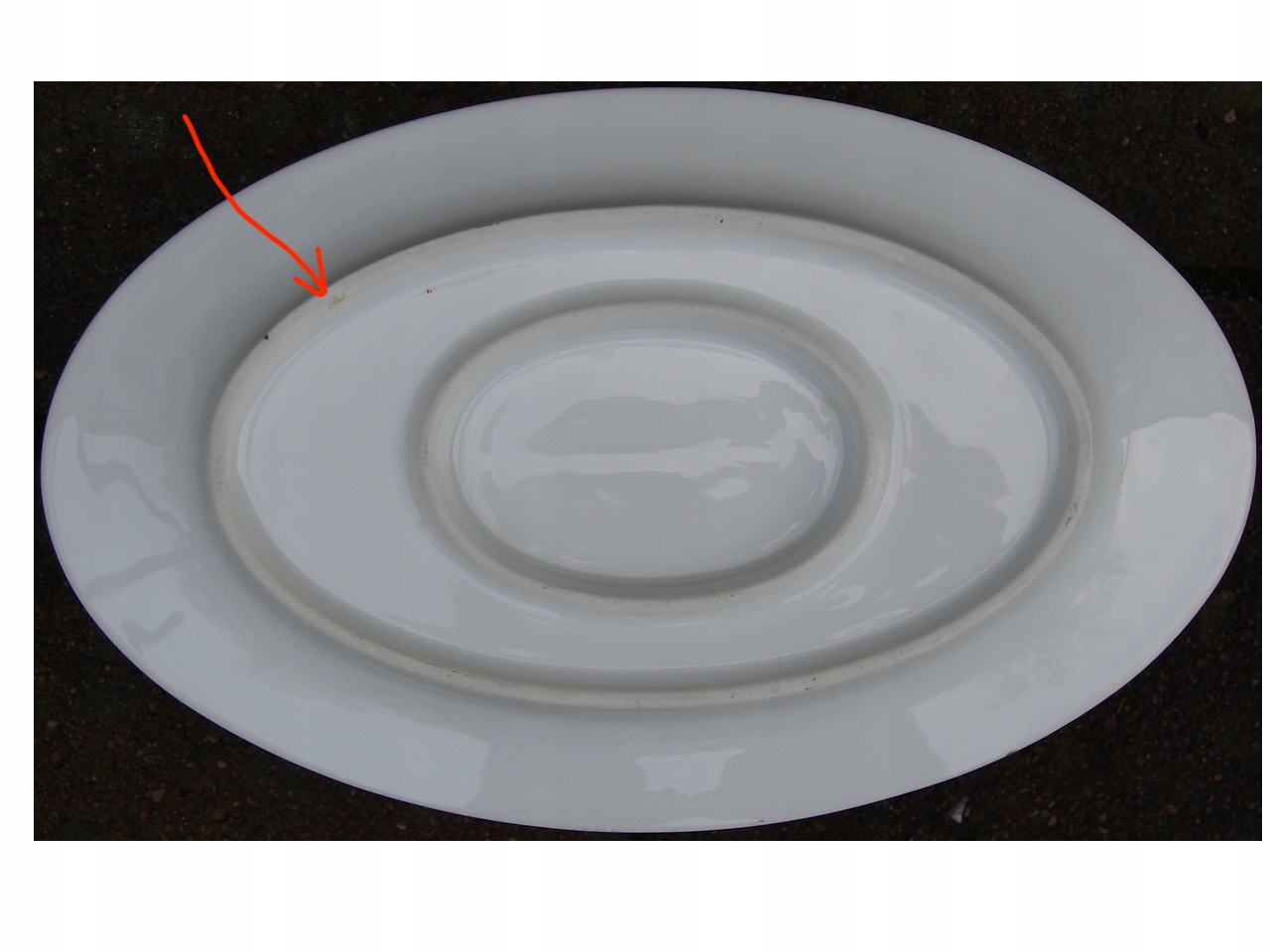 - Изделие в рабочем состоянии, с учетом возраста хорошо сохранилось, трещин не имеет. Позолота по краям имеет локальные потертости. Под дном кастрюли имеется небольшой скол, который не влияет на внешний вид и эксплуатацию. Место дефекта показано красной стрелкой.
