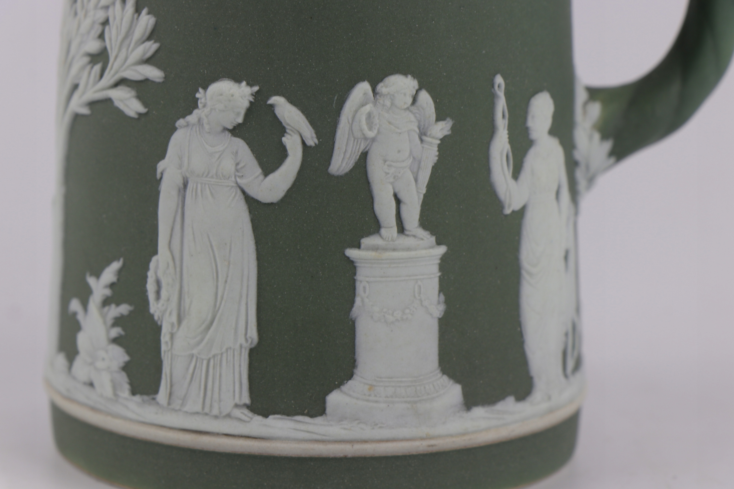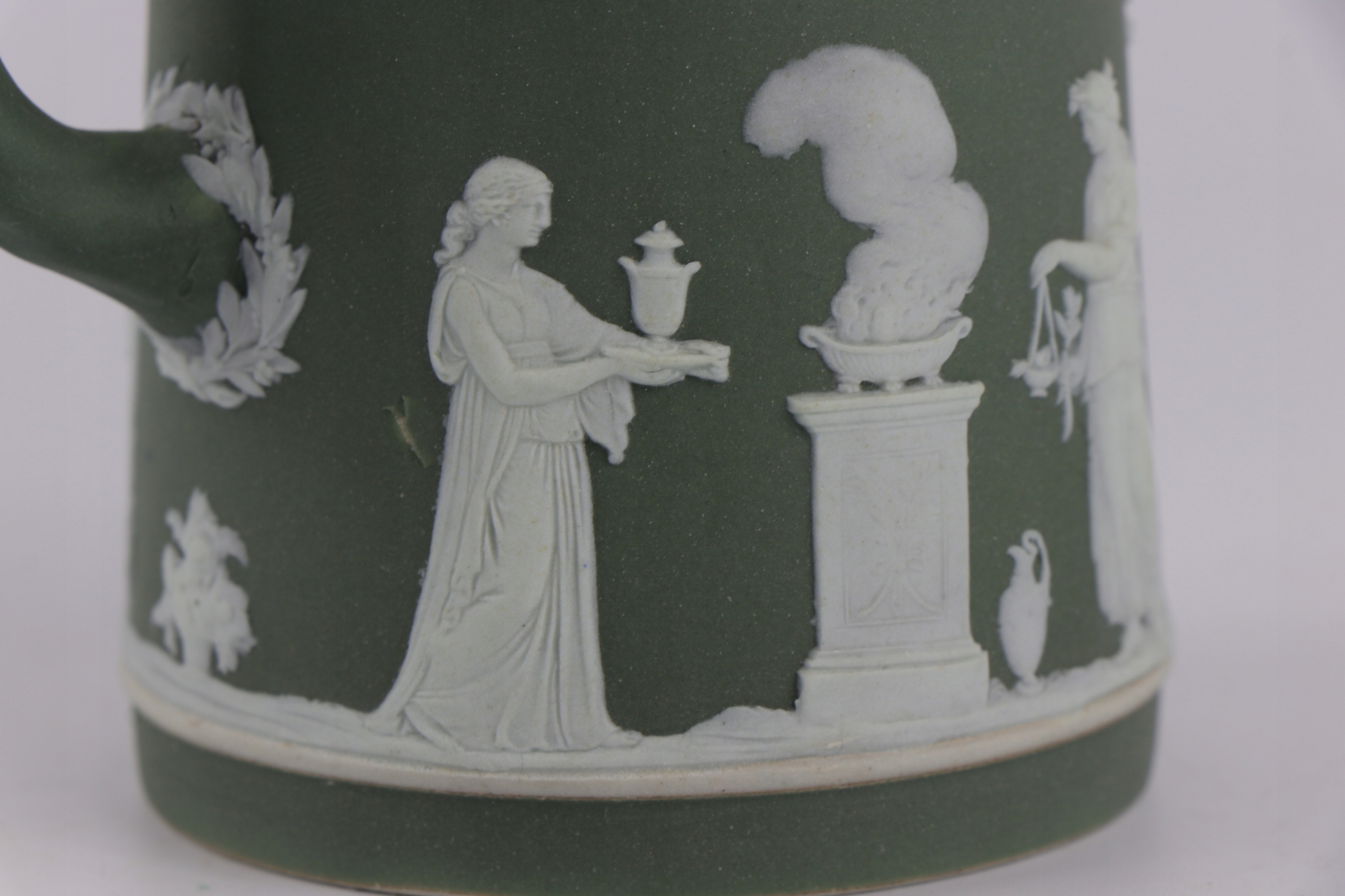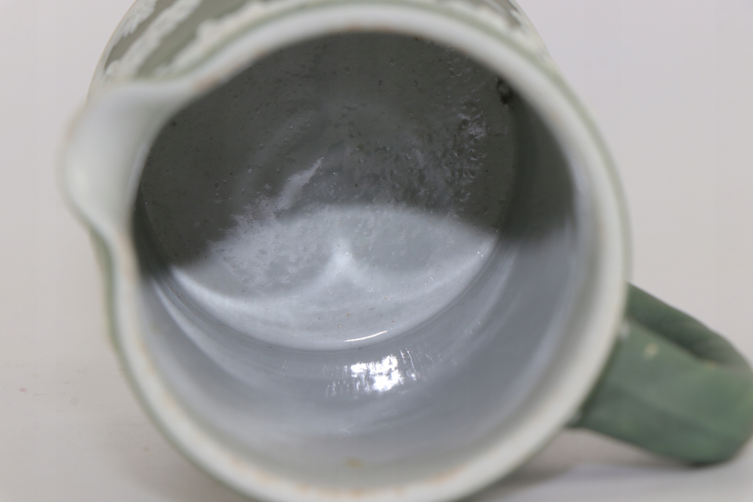 Фарфоровый кувшин Wedgwood из оливок и яшмы. Украшен рельефными бляшками с изображением старинных фигур. Застекленный интерьер.