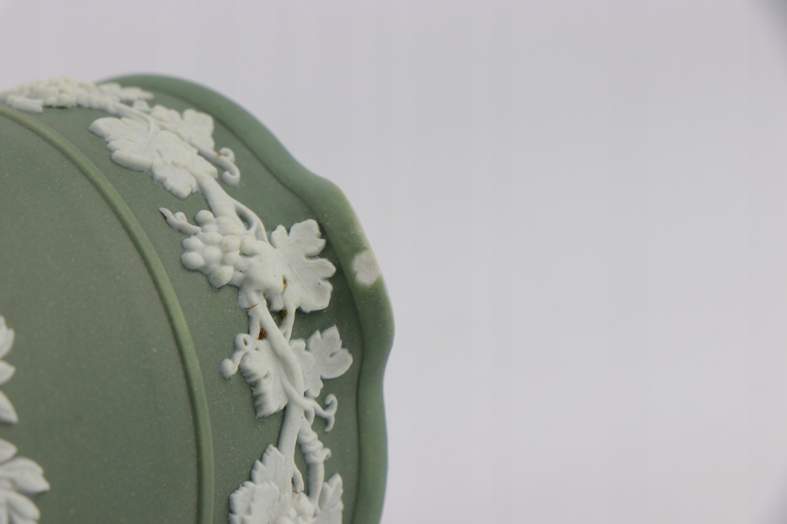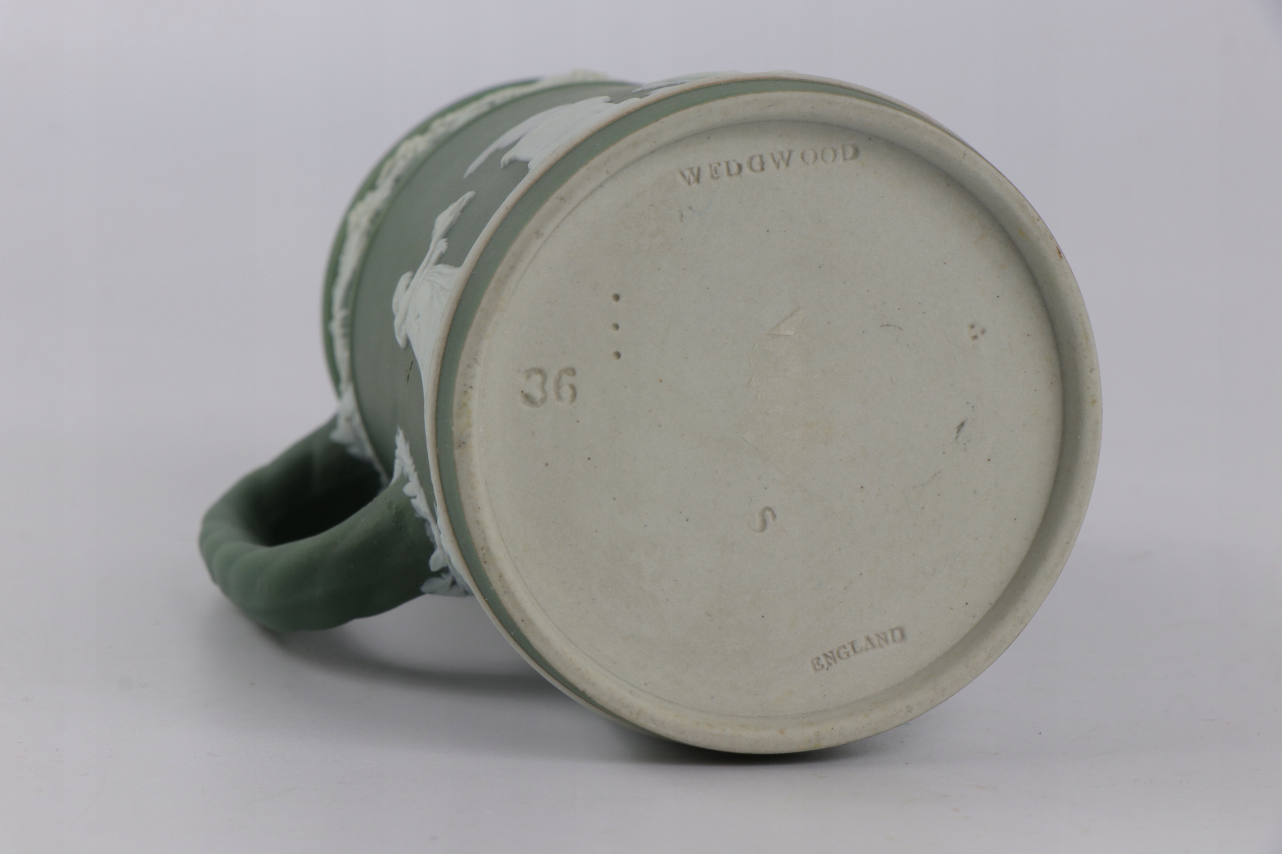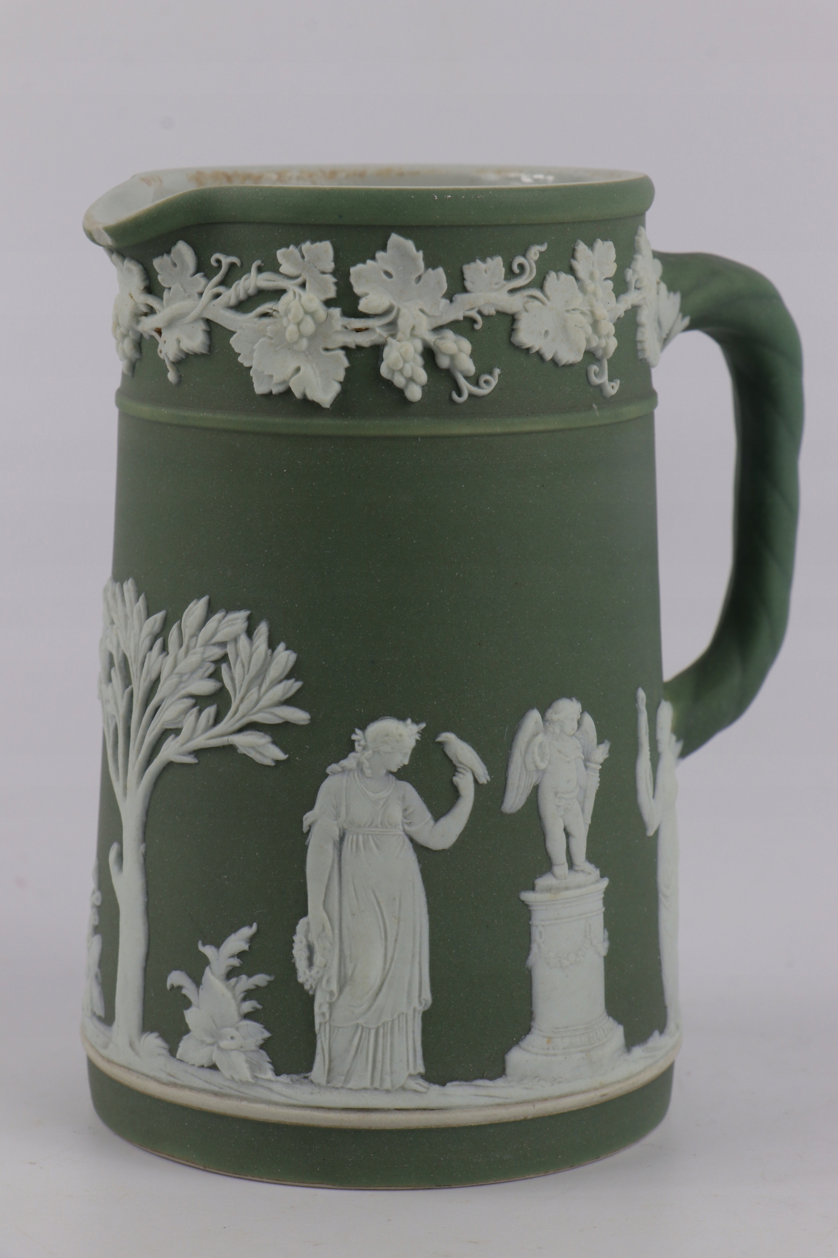 Фарфоровый кувшин Wedgwood из оливок и яшмы. Украшен рельефными бляшками с изображением старинных фигур. Застекленный интерьер.