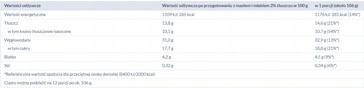 Состав: Тесто: мука пшеничная, сахар, крахмал рисовый, разрыхлитель (разрыхлители: дифосфаты, карбонаты натрия); эмульгаторы: эфиры жирных кислот и полиглицерина, моно- и диглицериды жирных кислот, полиоксиэтиленсорбитанмоноолеат; картофельный крахмал, сливки: сахар, кукурузный крахмал, пшеничная мука, картофельный крахмал, ароматизаторы, красители: куркумин, каротин
