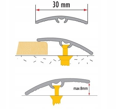 Полоски для порогов длиной 180 см и шириной 30 мм, изготовлены из алюминия. Они позволяют соединить различные поверхности пола, например, панели с панелями, панели с ковровым покрытием, панели с плиткой и т. д. Устраняют перепады уровней до 8 мм. Способ крепления невидим.