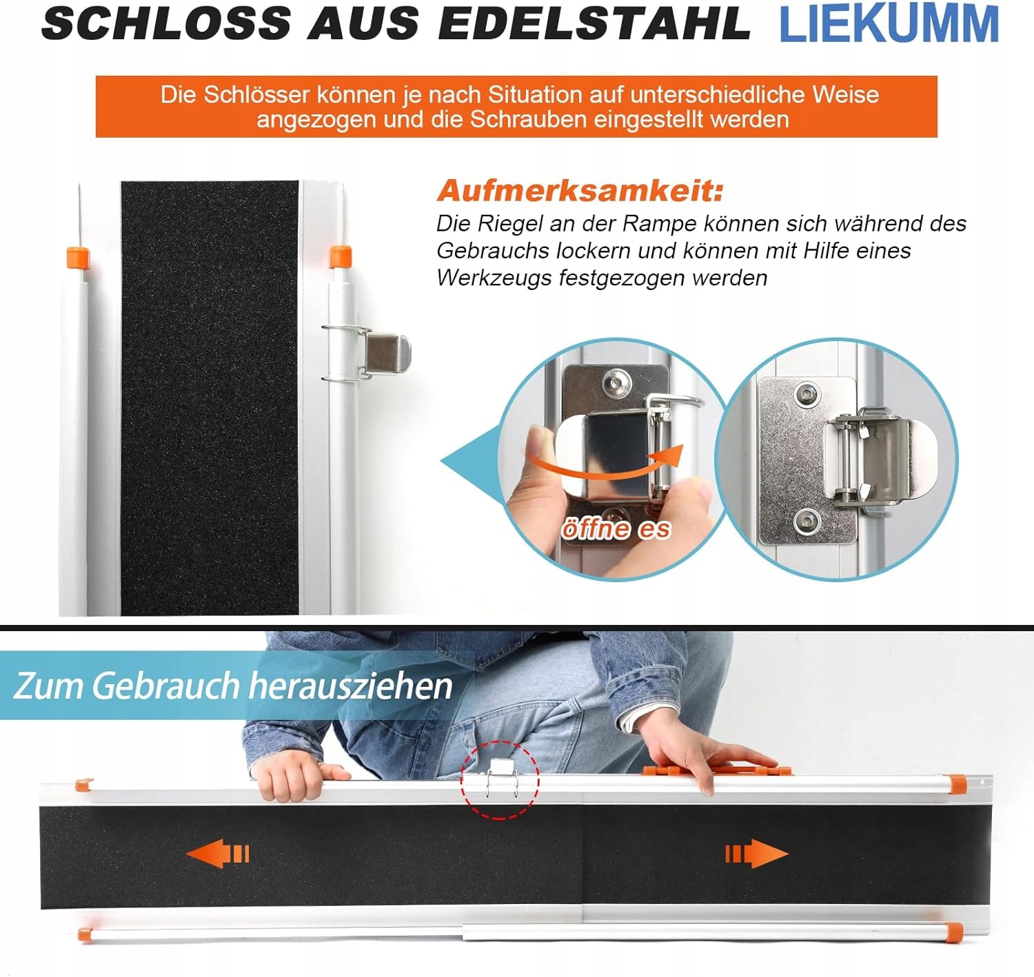 Универсальные функции: пандус для инвалидных колясок можно использовать не только в помещении, но и на открытом воздухе, например, у входа, на лестнице, для грузовых автомобилей, скутеров и т. д. Прочный алюминий: прочная алюминиевая конструкция выдерживает нагрузку 300 кг. Идеально подходит для скутеров и инвалидных колясок. Регулируемая длина: все затворы рампы изготовлены из нержавеющей стали. Благодаря закрытиям длину пандуса для инвалидных колясок можно изменить. Противоскользящая поверхность: Поверхность пандуса для инвалидных колясок имеет противоскользящее покрытие, обеспечивающее высокое сцепление и сопротивление скольжению.