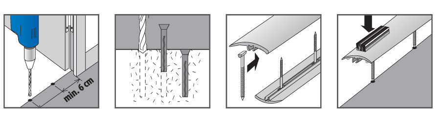 Полоски для подоконников длиной 90 см и шириной 40 мм из ПВХ. Они позволяют соединить различные поверхности пола, например, панели с панелями, панели с ковровым покрытием, панели с плиткой и т. д. Устраняют перепады уровней до 13 мм. Способ крепления незаметен. Поверхность покрыта прочным ламинатом, в значительной степени устойчивым к истиранию.