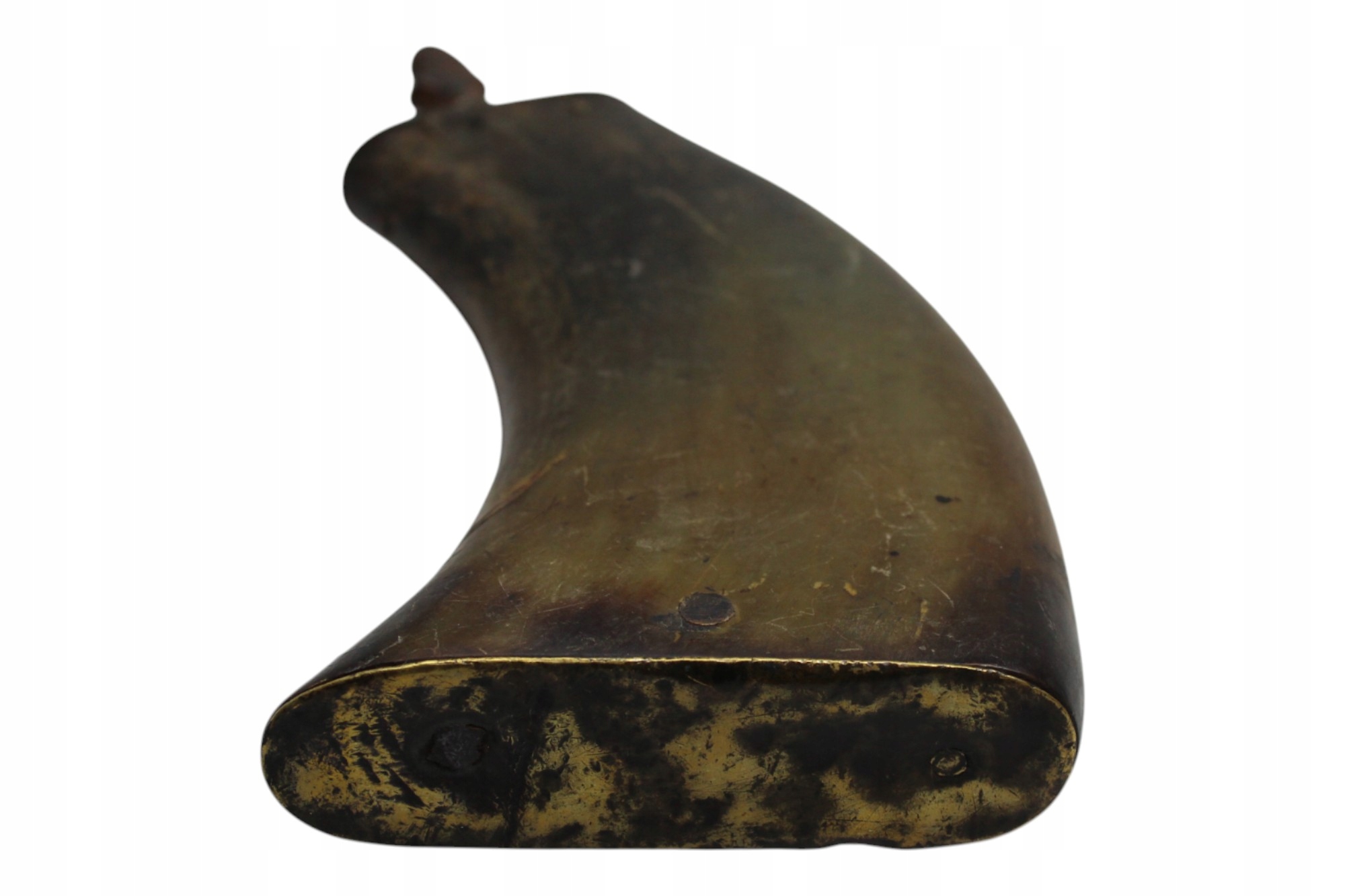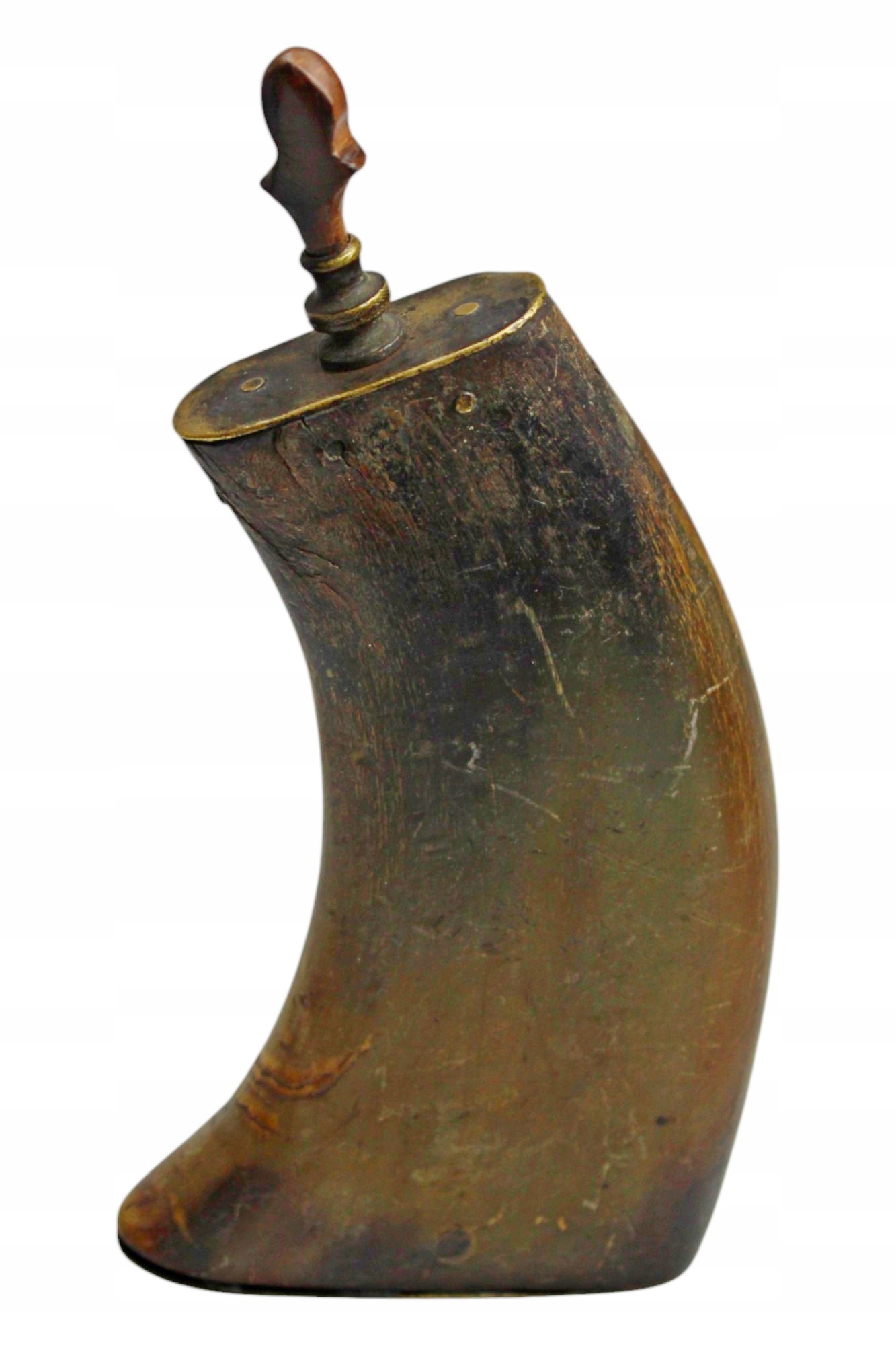 Контейнер ручной работы для пороха, характерно для периода использования камня и способного оружия. Корпус, изготовленный из естественного, тщательно сглаженного углу крупного рогатого скота с чистой патиной.