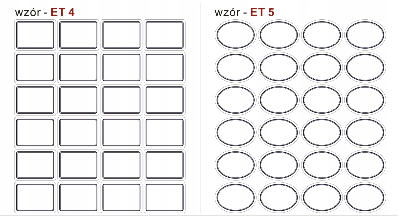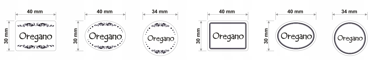 - Размеры одной наклейки: 34 мм, овальный 40/30 мм или прямоугольный 40/30 мм.