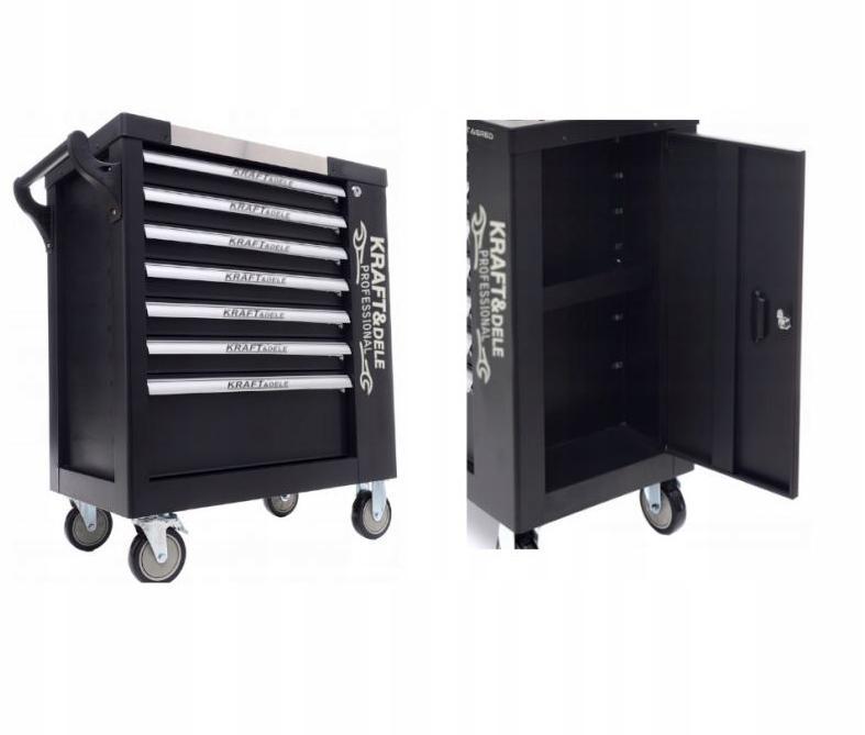 Имеет 7 выдвижных ящиков на шариковых подшипниках и двухуровневое отделение для хранения вещей, закрывающееся на ключ. Ящики имеют направляющие и шариковый механизм выдвижения, благодаря которому их легко выдвигать. Кроме того, каждый ящик имеет замок. Конструкция позволяет установить тиски на столешницу и дополнительные держатели для полотенец или химикатов с обеих сторон тележки. Тележка оснащена 4 поворотными роликами с автоматической блокировкой и тормозом, предотвращающим перемещение шкафа. Обеспечивает безопасность и комфорт даже на небольших склонах. Ящики покрыты мягким и гибким материалом ЭВА, который сохраняет свои свойства даже при различных температурах.