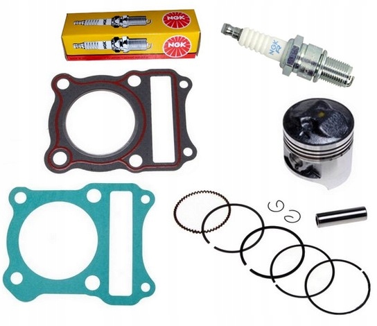 В комплект входят: поршень, палец, защиты, кольца, прокладки цилиндра, свеча зажигания 12 NGK.