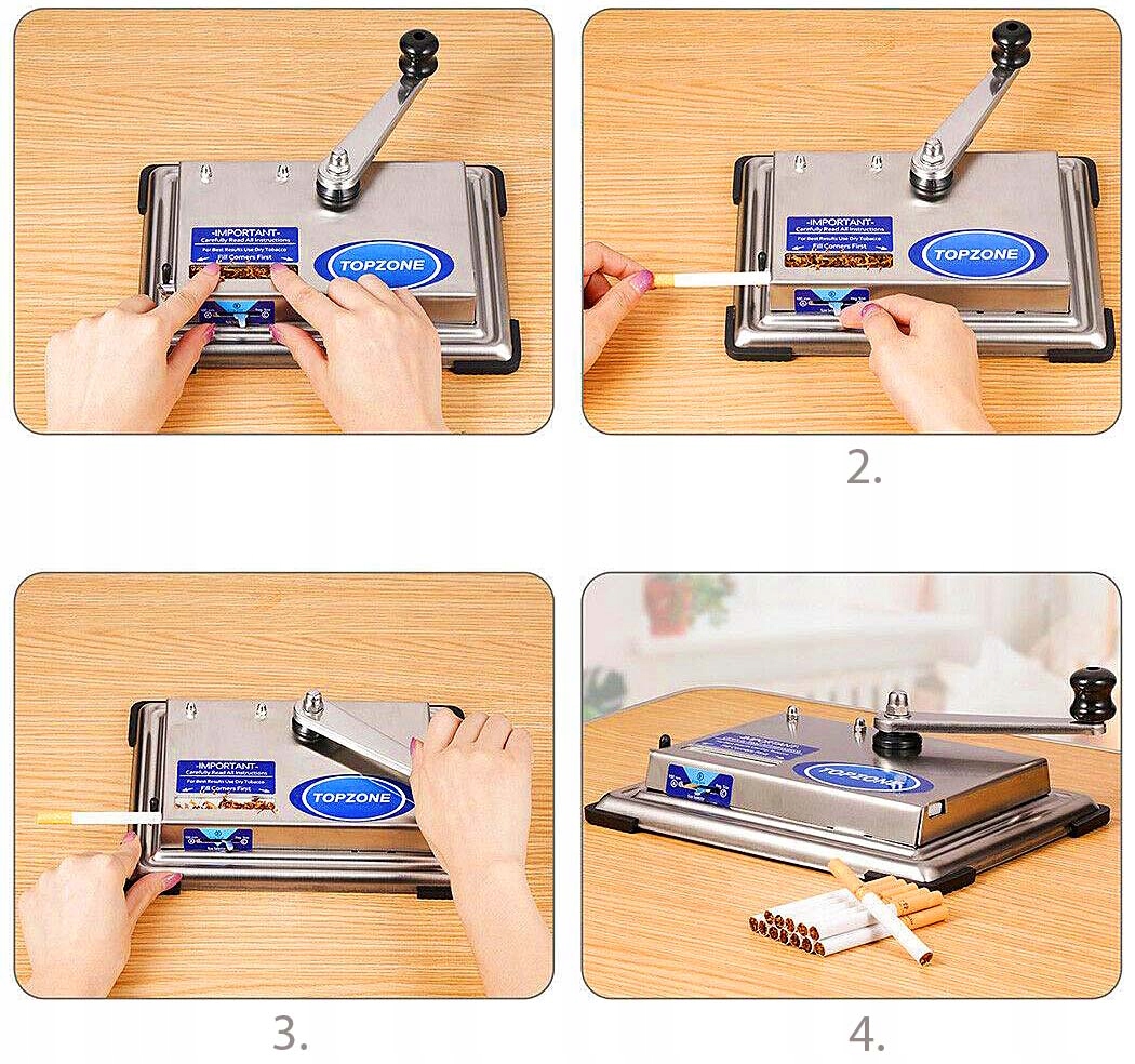 Наполнительная машина очень проста в использовании. Все, что вам нужно сделать, это открыть отверстие для табака, вставить трубку, заполнить отверстие табаком, установить длину трубки с помощью ручки, поверните ручку автомата и сигарета готова.