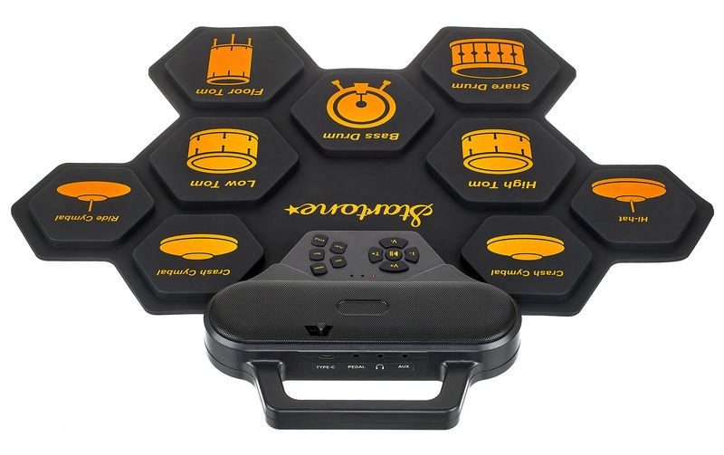 - Коврик с шестиугольными накладками для большого барабана, малого барабана, трех томов, хай-хэта, двух крэш-тарелок и одной тарелки райд.