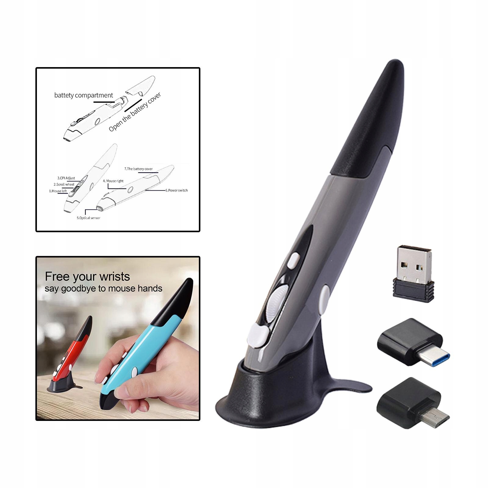 Портативна бездротова ручка для миші 2.4G, CPI 800 1200 1600, настроюється сірим