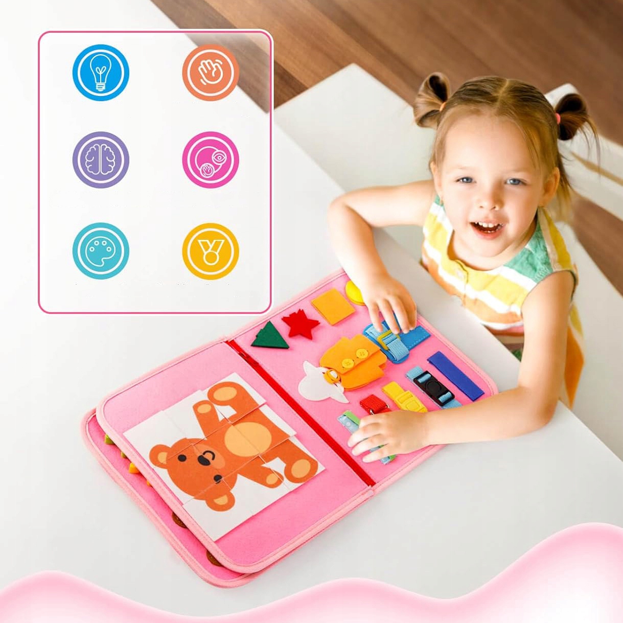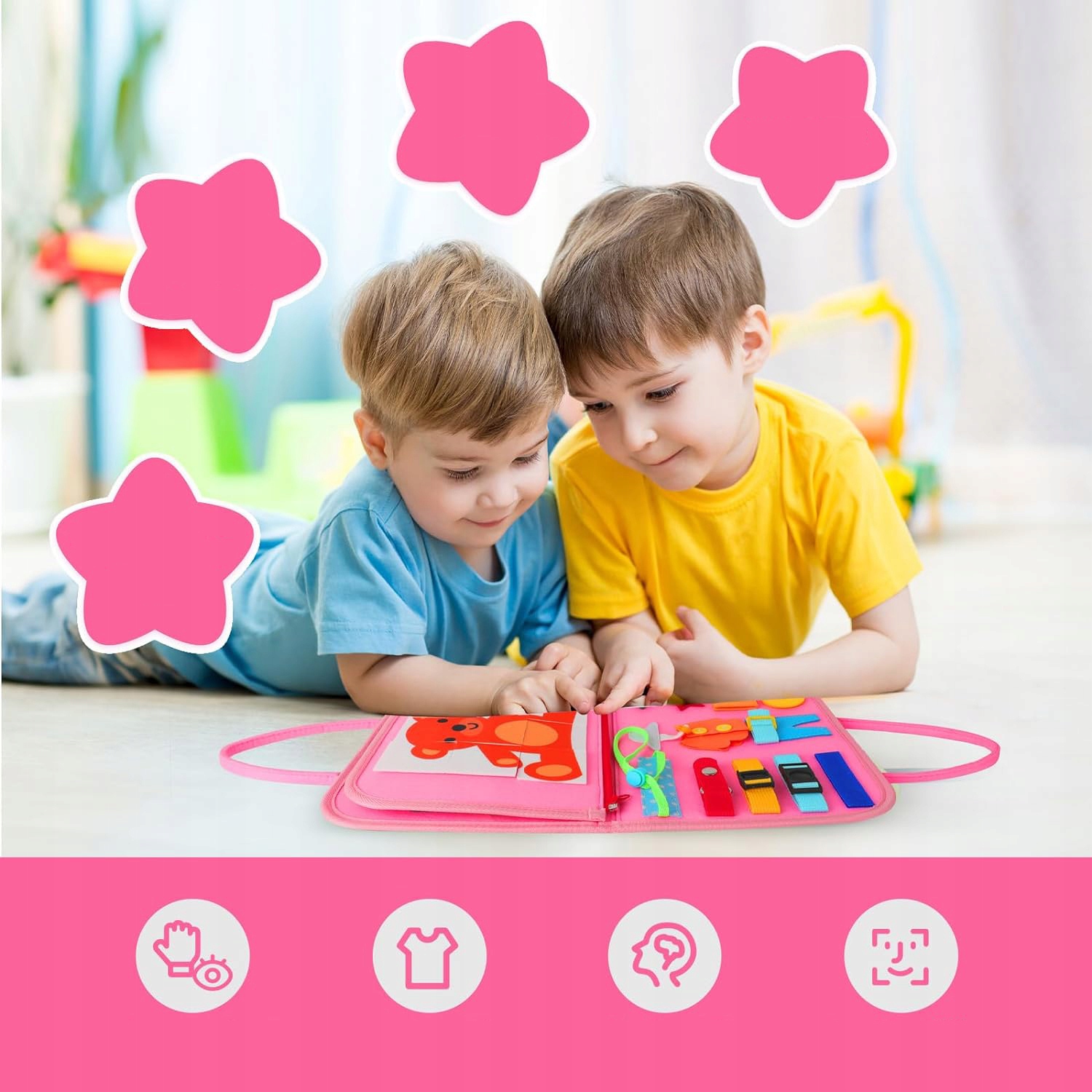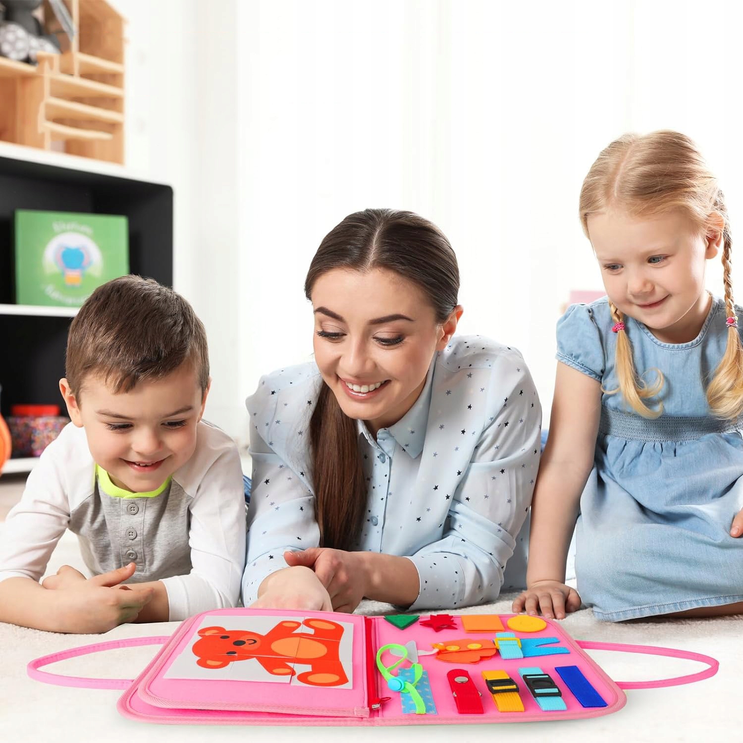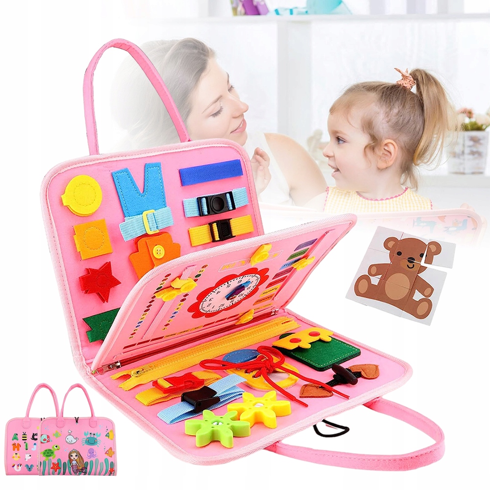 🎒 Toys Montessori: Busy Board - это забавная игрушка, которая использует образовательный метод Монтессори, основанный на реальном моделировании, независимом обучении и сотрудничестве. Позвольте вашему ребенку изучать моторные навыки во время игры. Занятая доска идеальна в качестве образовательной игрушки для дошкольников, как для девочек, так и для мальчиков. Это сделает ваших малышей занятыми и занятыми. Он включает в себя элементы, связанные с одеждой, которые помогают улучшить ловкость пальцев ребенка и позволяют малышу научиться одеваться. Сенсорная игрушка содержит даты, головоломки и т. Д. Это помогает развивать детей, изучая время, отличия цвета и пространственное мышление.