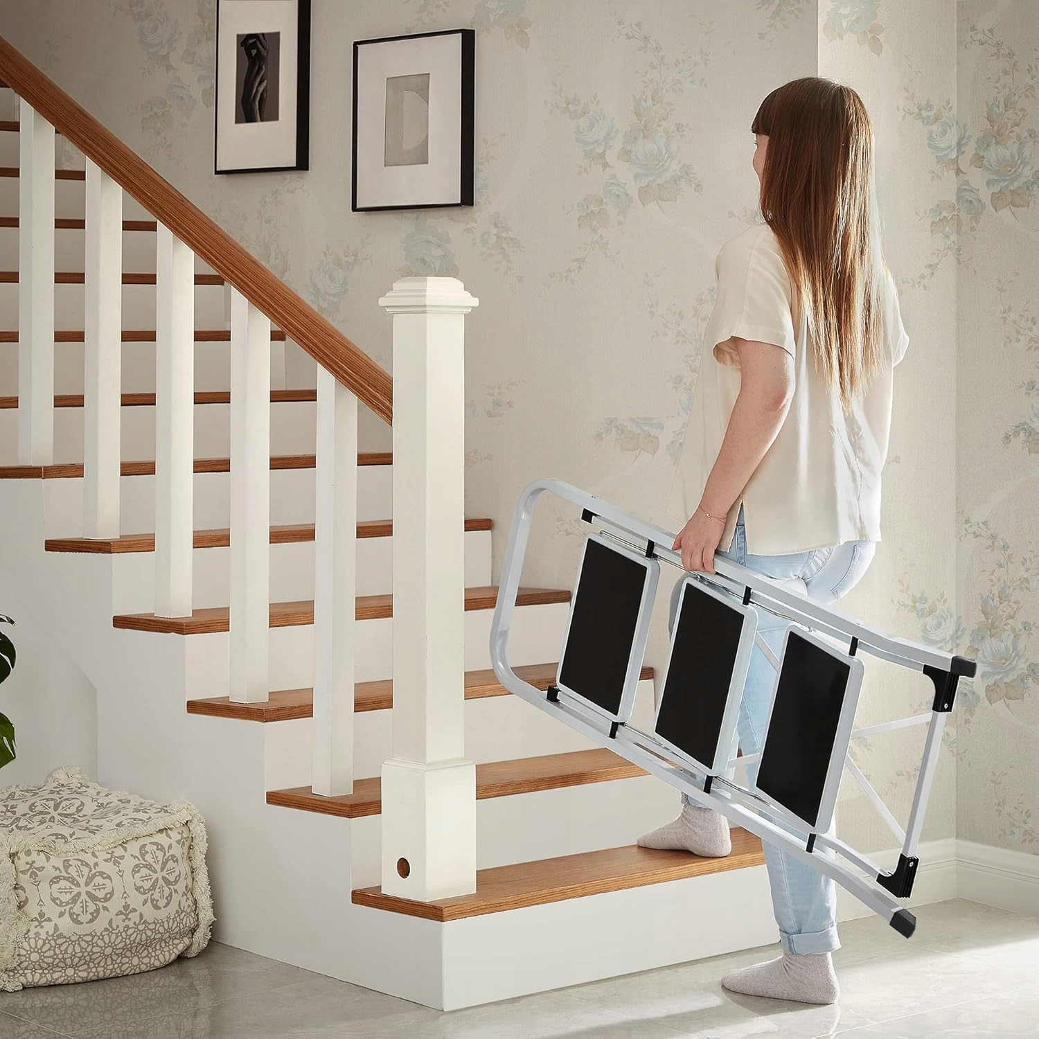 Легкий транспорт с ручкой: Сложная лестница имеет размеры 46,5 х 4,5 х 117 см и весит 5,5 кг. Благодаря ручке его легко носить. Когда он не используется, его можно помещать в угол гаража, чтобы сохранить пространство