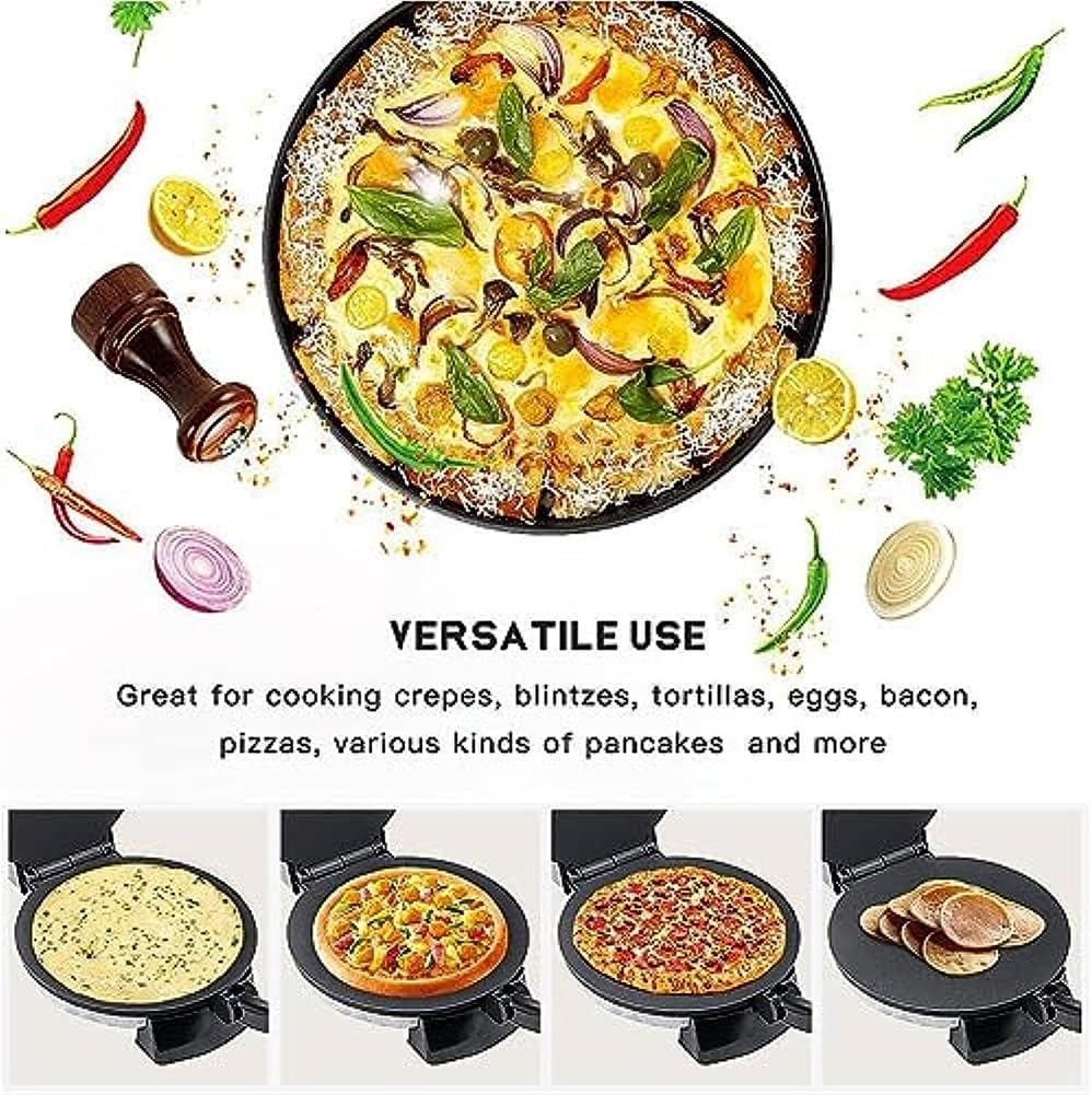 Приготовьте вкусные блины Электрическая блинница позволяет легко приготовить вкусные сладкие и соленые блины для всей семьи. Украсьте их любимыми лакомствами, такими как шоколад, фрукты и сливки. Большая поверхность для приготовления пищи с антипригарным покрытием. В этой электрической блиннице нет мини-блинов. Большая поверхность диаметром 12 дюймов позволяет готовить тонкие французские блины или толстые американские блины. Плавный контроль температуры Эта мощная электрическая блинница мощностью 1800 Вт может достигать температуры до 250°C, но вы можете контролировать температуру приготовления с помощью ручки на передней панели. Простота в использовании. Эта машина является самой простой и легкой в уходе на всей кухне. Антипригарное покрытие варочной панели означает, что пища не пригорает и не прилипает к поверхности. Для очистки просто протрите пластину влажной тканью. Широкий спектр применения. С помощью этой универсальной машины можно готовить не только блины, но и блинчики с начинкой, сухие слоеные пирожные, лепешки и другие. Его легко чистить и устанавливать, поэтому он незаменим для каждого любителя завтрака.