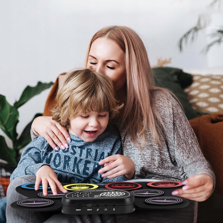 -Эту ударную установку, изготовленную из прочного силикона, можно легко свернуть и удобно носить с собой куда угодно.