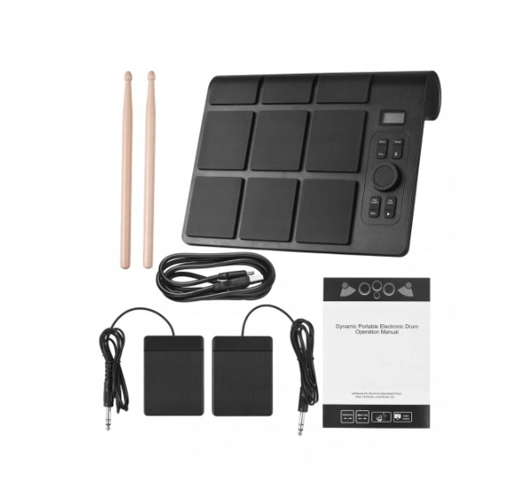 Портативная электронная ударная установка с 9 пэдами, педалями и палочками.