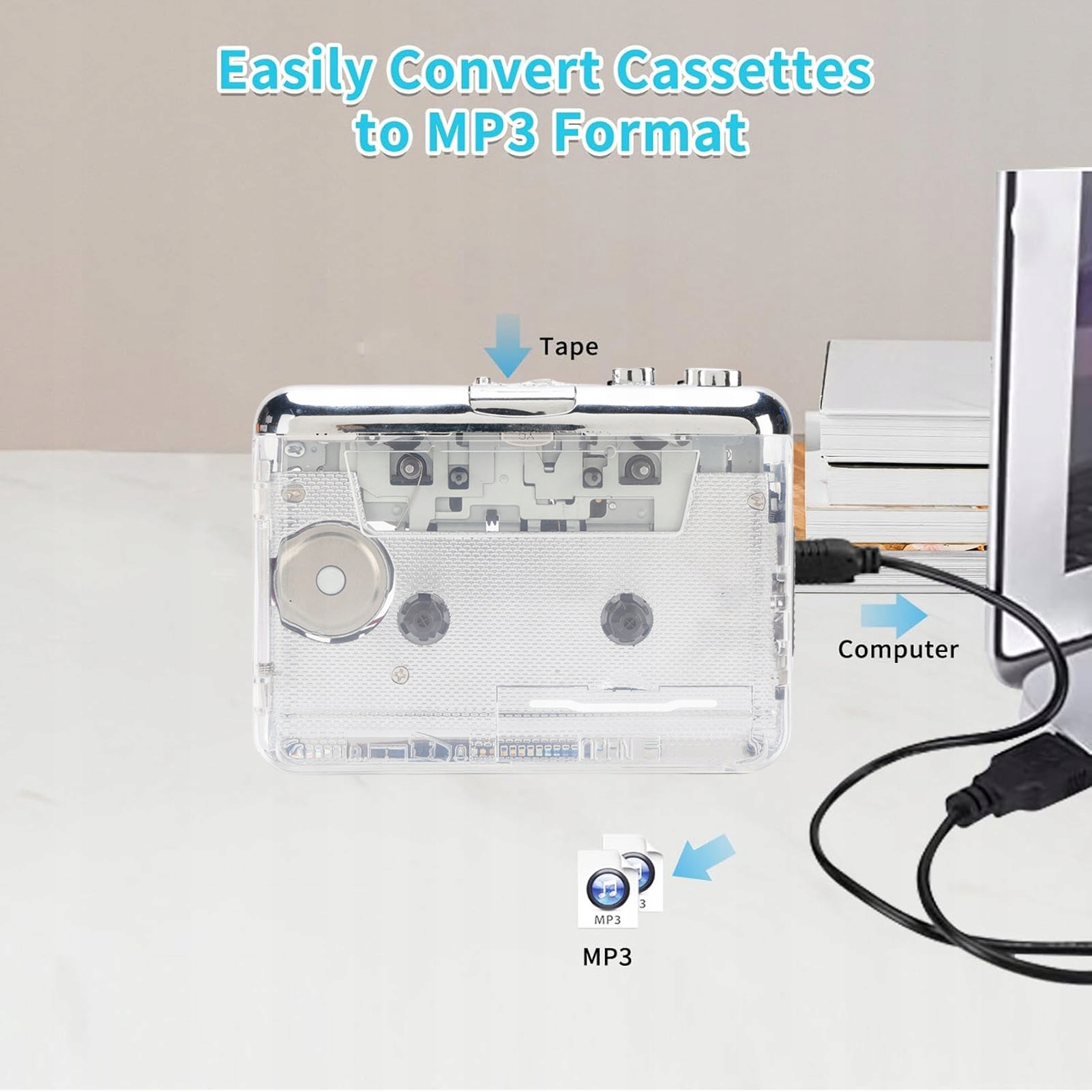 2. Запишите и преобразуйте кассету в mp3: позволяет конвертировать музыку кассеты в формат MP3. Просто подключите игрока к компьютеру, используя включенный кабель USB C и используйте программное обеспечение для отправки музыкальной кассеты на компьютер. Вы также можете персонализировать и отредактировать записанную MP3 -музыку на своем компьютере. Вы даже можете использовать Aux Cable для записи внешнего звука на компьютере, например, с помощью компакт -дисков, DVD, радио и других.