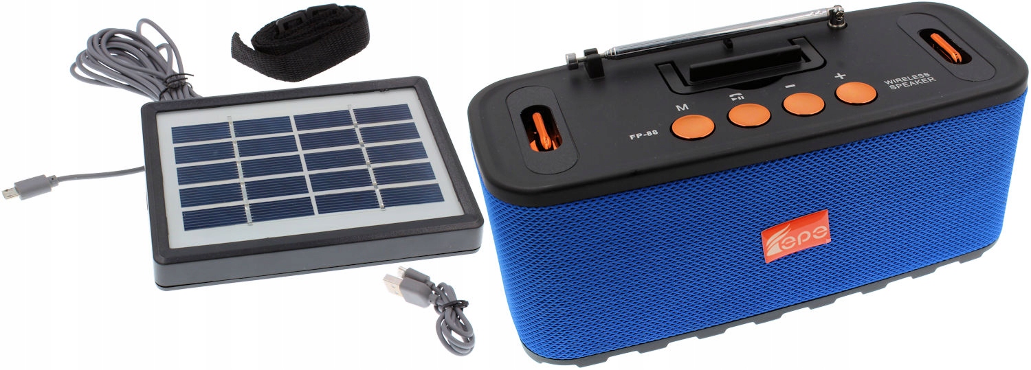 Портативная и компактная колонка, позволяющая слушать музыку где угодно и когда угодно. Благодаря ему вы можете слушать любимые песни во время работы, занятий спортом, летних каникул или встреч с друзьями. Динамик может воспроизводить музыку с телефона с помощью модуля Bluetooth. Устройство также поддерживает карты памяти, USB (например, флэш-накопитель) и разъем Audio AUX Minijack 3,5 мм. Оно также может работать как обычное радио. Он оснащен сменным аккумулятором 18650 емкостью 1200 мАч, который можно заряжать с помощью солнечной панели, в комплект также входит USB-кабель microUSB.