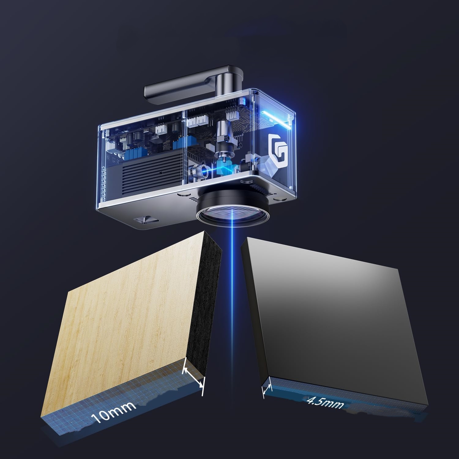 - Доступные материалы: Подходит для гравировки или резки дерева, акрила, кожи, ткани, металла, керамики и других материалов.