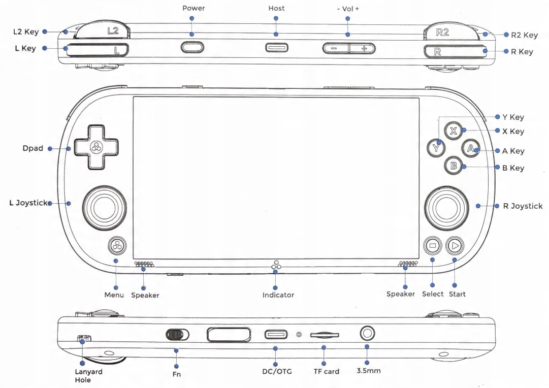 В нижней части консоли расположены: отверстие для шнурка (отверстие для шнурка), функциональная кнопка (Fn), порт DC/OTG (DC/OTG), слот для карты TF (карта TF) и разъем для наушников 3,5 мм (3,5 мм).