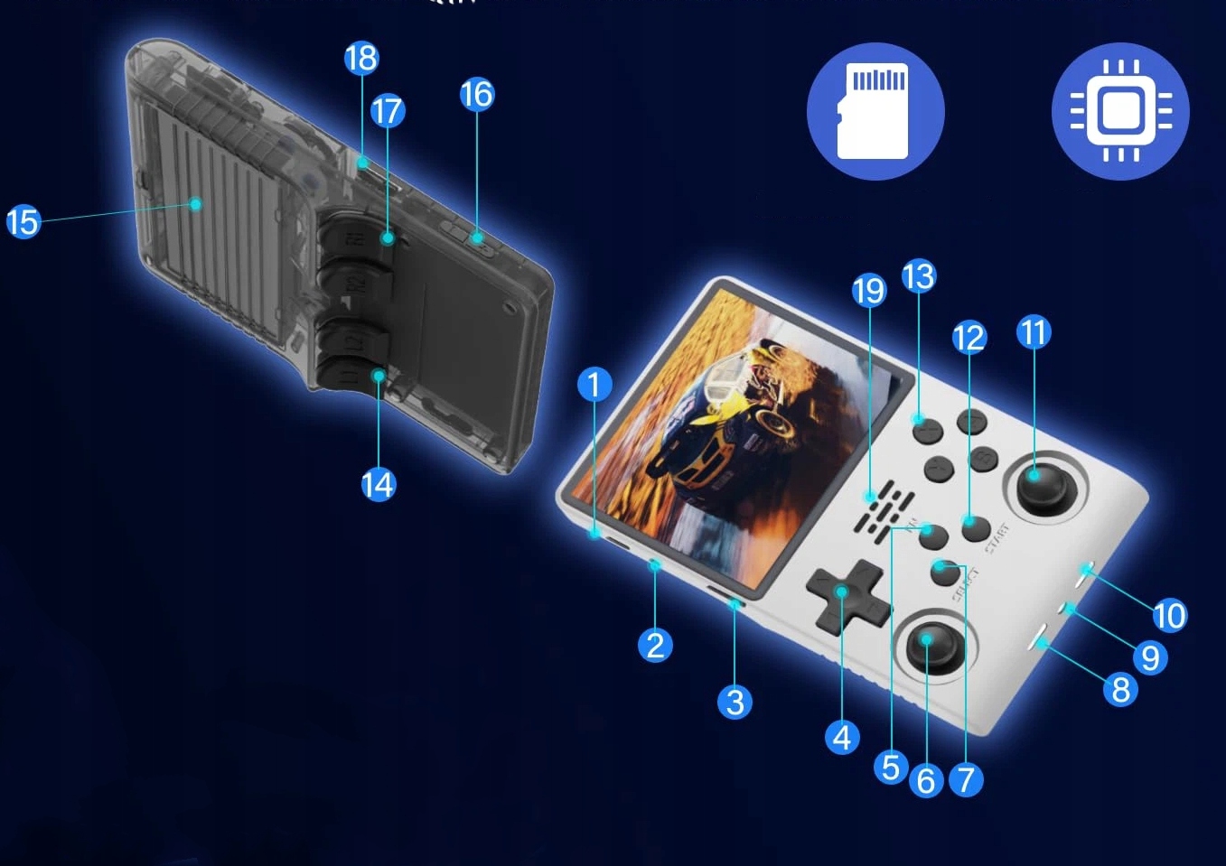 Портативная конструкция с аккумулятором емкостью 3800 мАч:Встроенный аккумулятор обеспечивает до 10 часов работы, что идеально подходит для мобильных ситуаций. Консоль оснащена встроенными динамиками и разъемом для наушников 3,5 мм для захватывающего звучания.