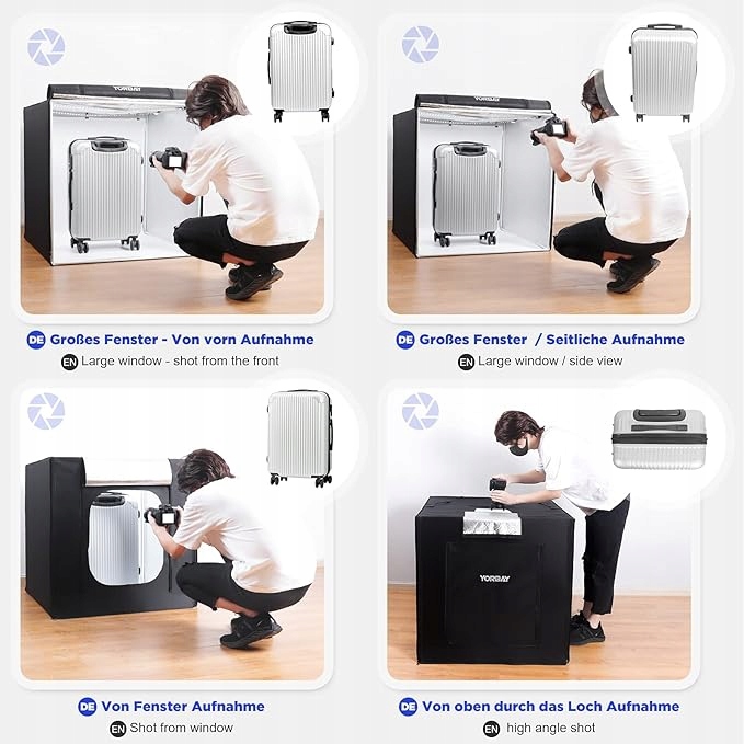Yorbay Studio Photo 80 x 80 x 80 см CRI 95+ Светодиодный фтобокс легкий куб Профессиональная фотография Светловая палатка с 4 фоном из ПВХ фольги, много -использованный задний или передний свет с магнитами. Таким образом, освещение и свет могут быть адаптированы к вашим потребностям. Это также относится к ориентации камеры, потому что в световых кубиках с практическими отверстиями можно сфотографироваться как спереди, так и сверху.