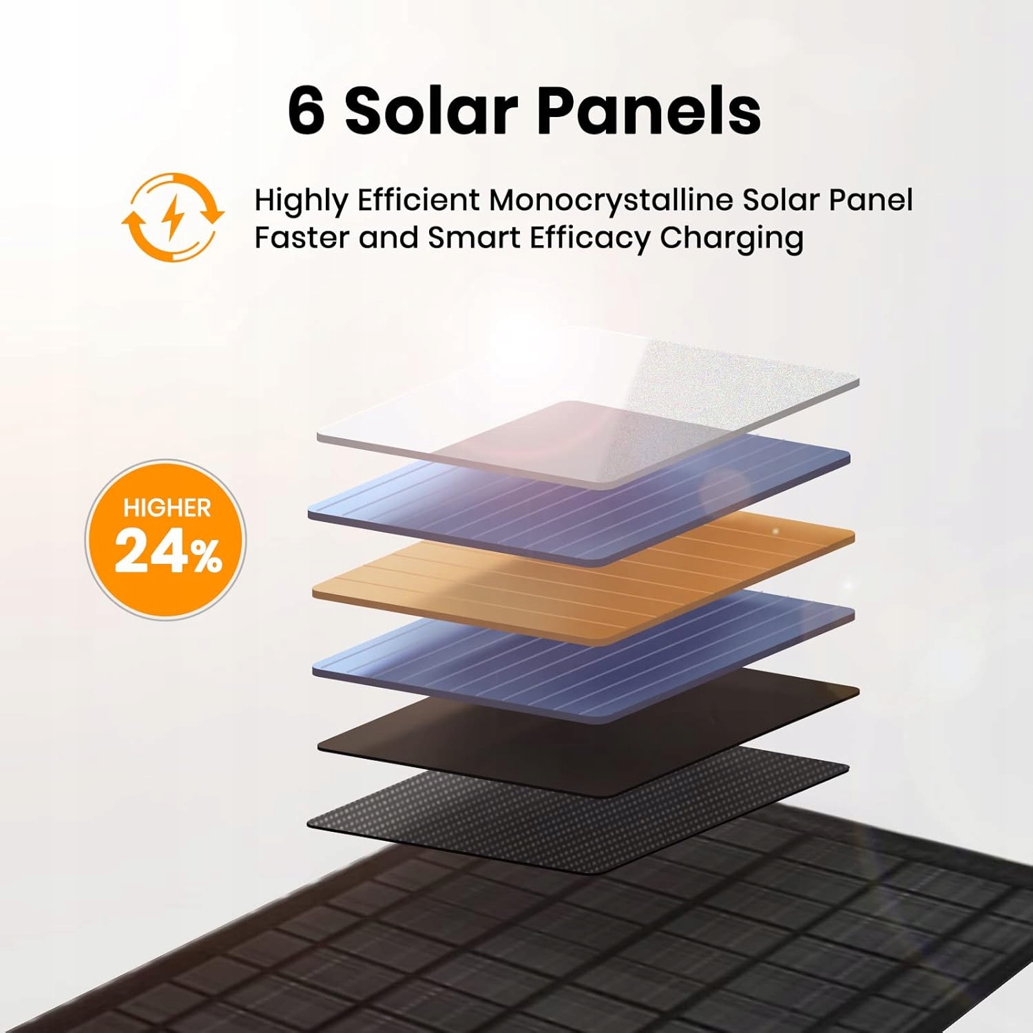 Сменщик солнечной панели мощностью 40 Вт покрыт материалом ETFE с высоким коэффициентом пропускания света. По сравнению с обычными солнечными панелями эффективность солнечного зарядного устройства FlexSolar 40 Вт достигает 24 %. Это позволяет складной солнечной панели производить значительно больше электроэнергии при том же размере панели и времени зарядки.