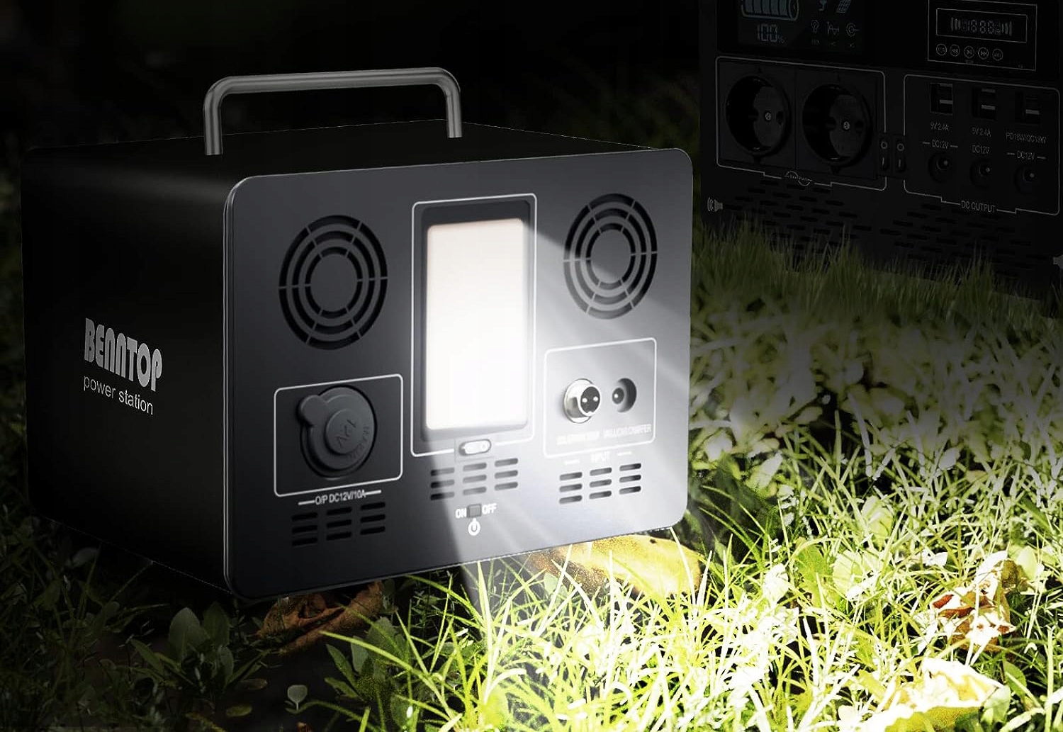 Портативная электростанция BENNTOP 327 Втч с аккумулятором LiFePO4, разъемом для солнечной панели, накопителем энергии 327 Втч/230 В + преобразователем 500 Вт/230 В, портативным светодиодным освещением с разъемами для зарядки USB/QC3.0, выходом для автомобильного прикуривателя 12 В, динамиком Bluetooth и запасной литий-ионный аккумулятор для кемпинга и вечеринок.