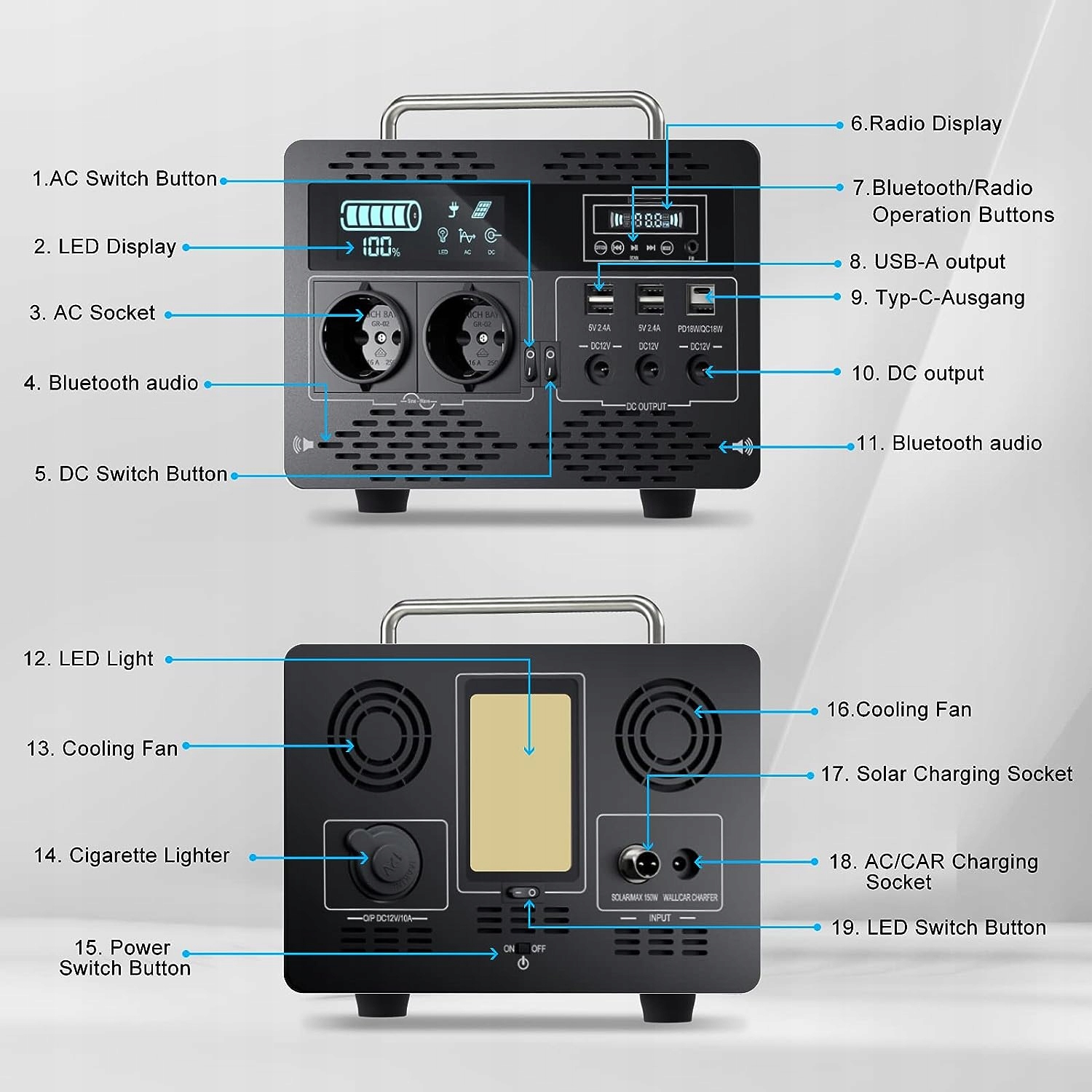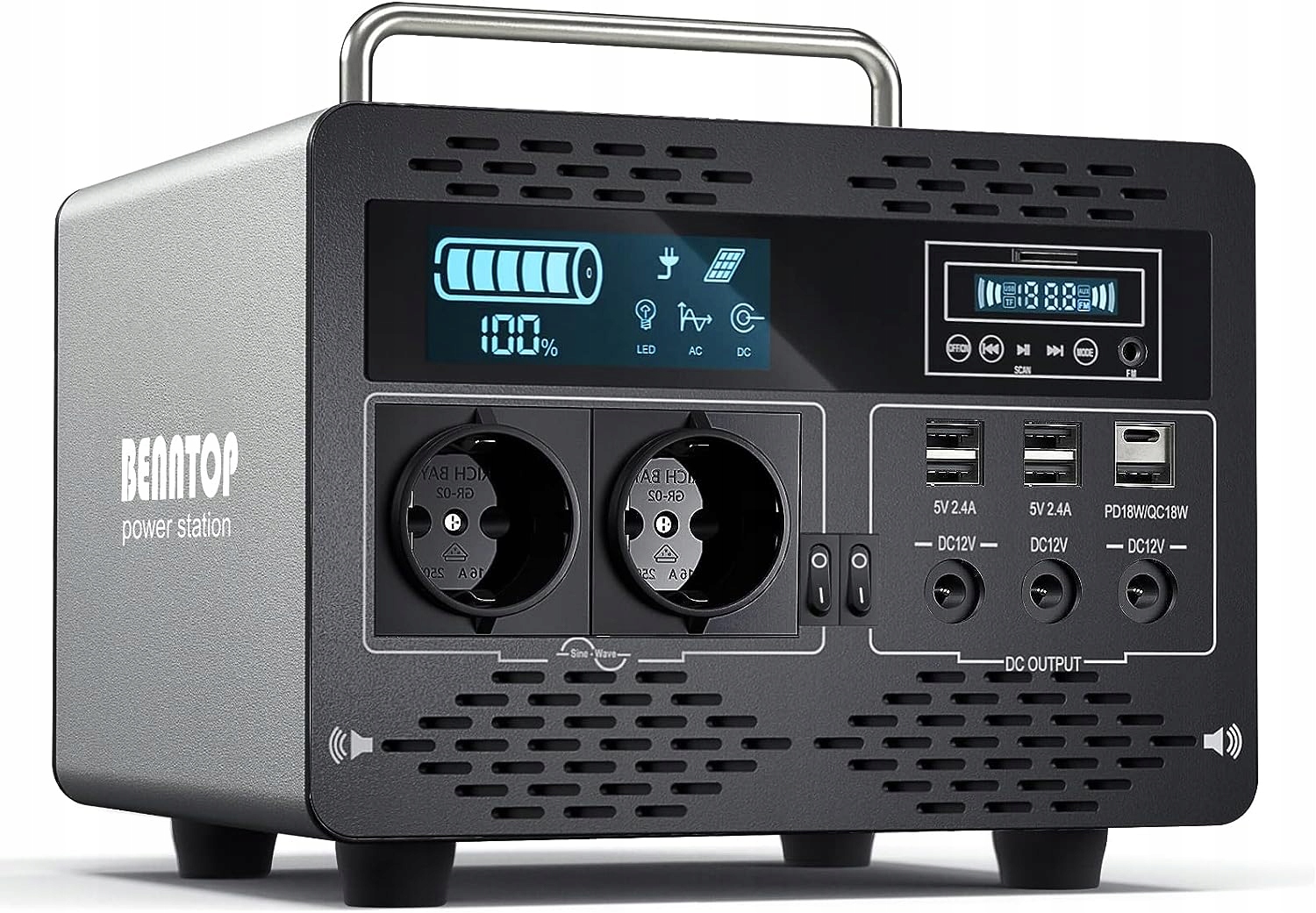 Вес TOP500 (9 кг) позволяет легко переносить его, а его небольшой размер не занимает много места. Алюминиевый внешний корпус обеспечивает лучшую защиту. Он имеет 2 розетки переменного тока, 3 розетки постоянного тока, 4 розетки USB, 2 розетки PD/QC и 1 розетку прикуривателя автомобиля.