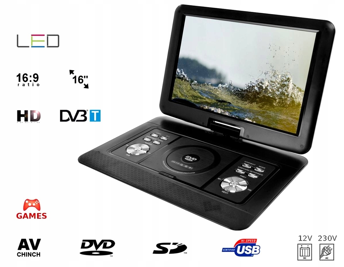 портативный DVD-плеер с цифровым телевизионным тюнером (TV) LCD 16 "Cali DVB-T MPEG-4/2 DVD USB SD Games 12V 230V