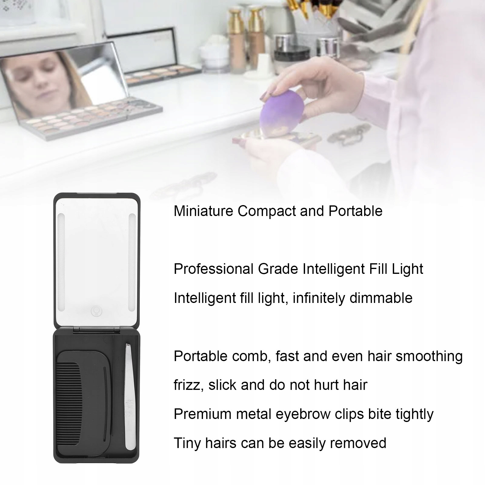 3. С металлическим зажимом для бровей: Зеркало для макияжа с подсветкой поставляется с металлическим зажимом для бровей, изготовленным из высококачественных материалов, что обеспечивает долговечность и эффективность. Металл премиум-класса плотно кусается, тонкие волосы легко тянуть за волосы.