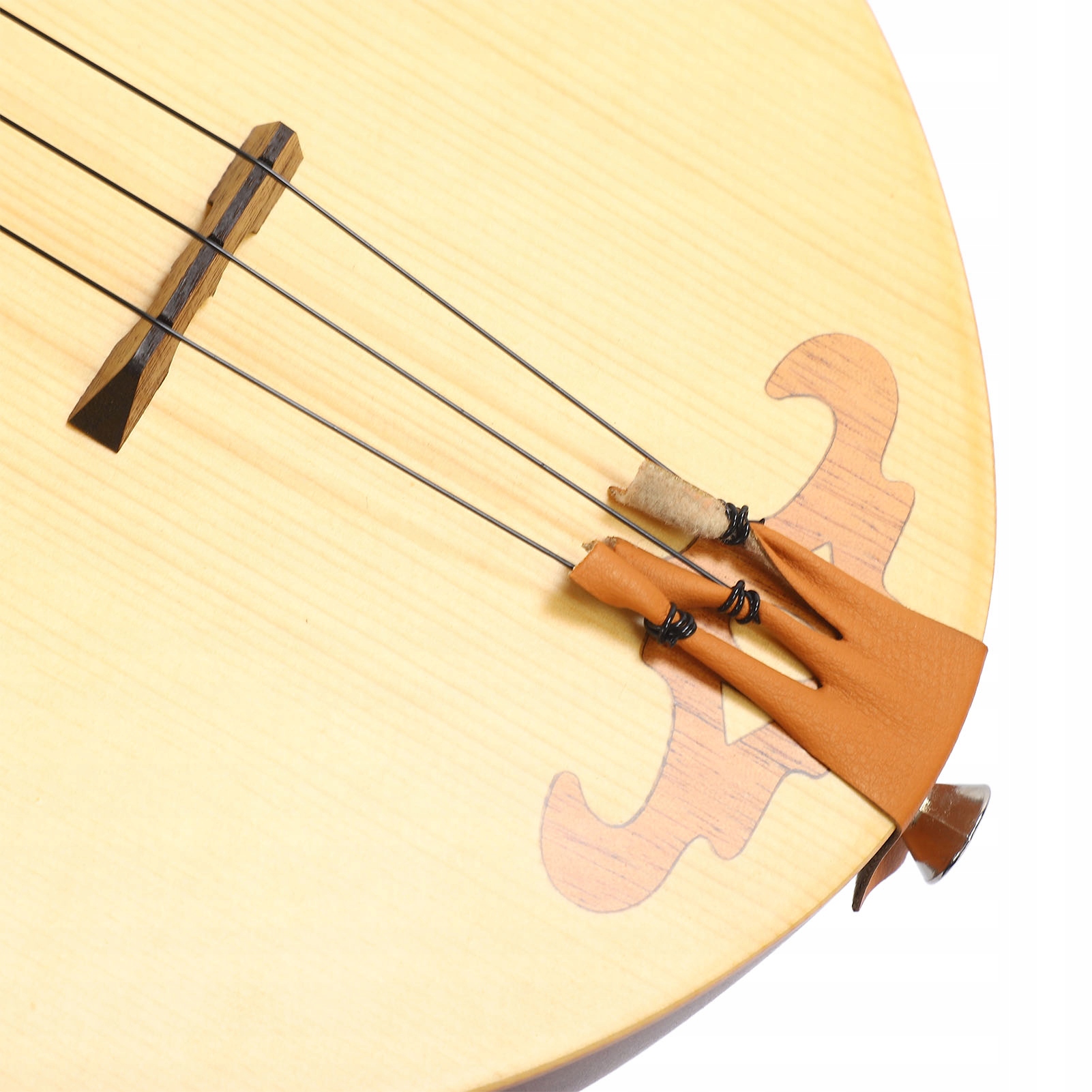 2. Трехструнная конструкция. Эта гитара с цимбалами имеет трехструнную конструкцию: навитая струна вверху, плоская струна посередине и две одинаково настроенные плоские струны внизу.