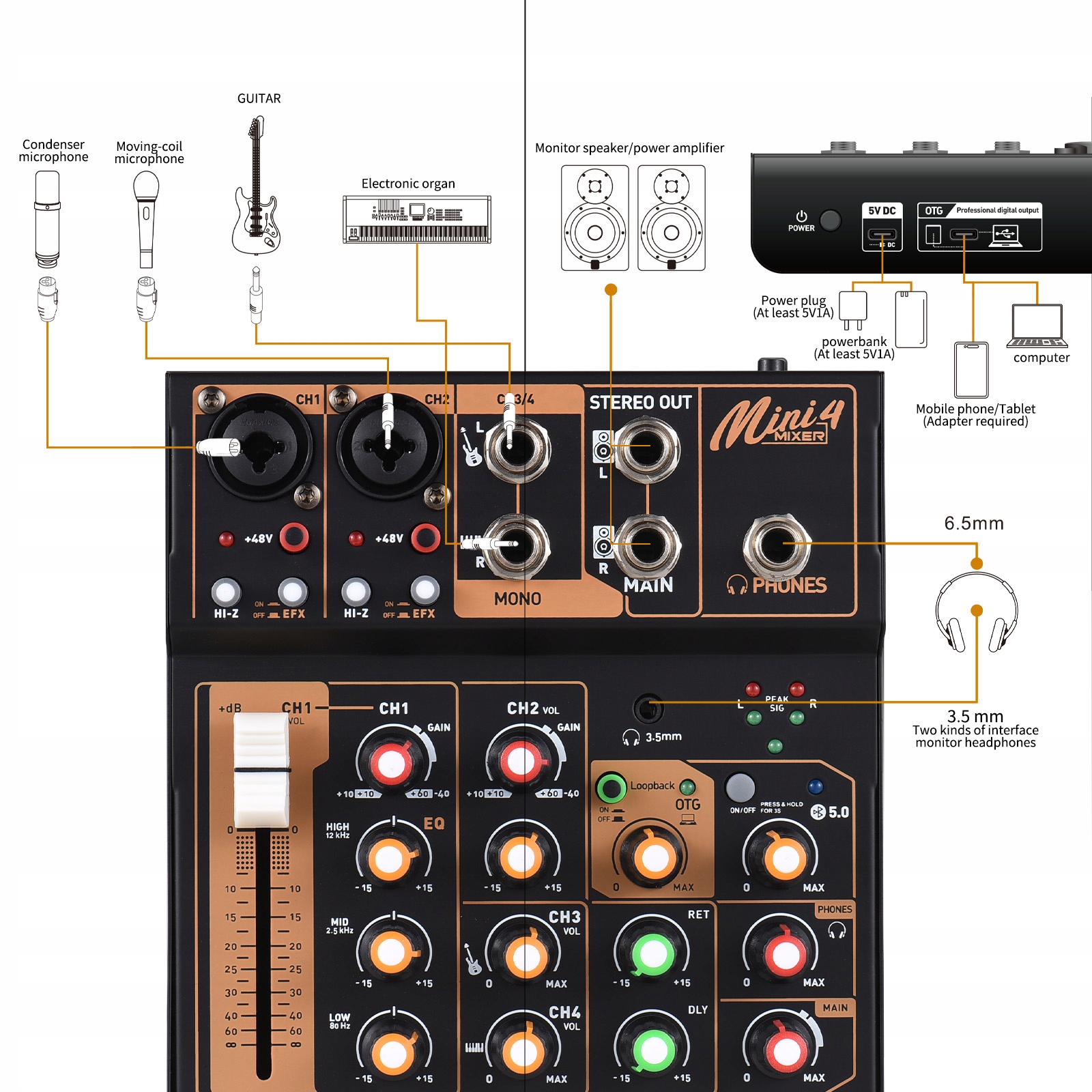 4. 【Многоцелевые приложения】: без особых усилий подключать различные устройства и наслаждаться записи без потерь и живого микширования. 4-канальная конфигурация микшера обеспечивает достаточное количество входов для микрофона и приборных соединений, что дает вам полный контроль над вашей настройкой звука.