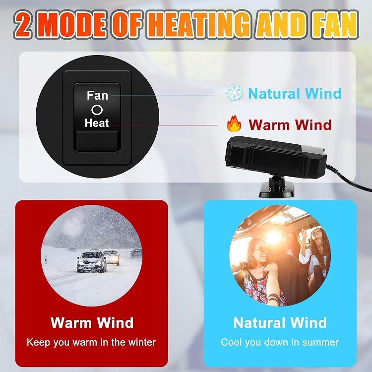 - Теплый. и регулировка холодного ветра. Жара – это теплый ветер, а вентилятор – это прохлада. Этот автомобильный обогреватель не только очень хорош для размораживания/запотевания, но также может использоваться в качестве охлаждающего вентилятора летом, доступен круглый год.