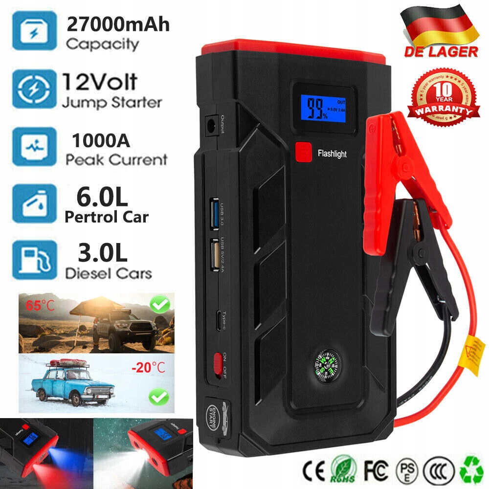 Благодаря емкости 27000 мАч, пусковому току 500 А и пиковому току 1000 А он станет хорошим помощником, когда ваш автомобиль внезапно сломается или разрядится. или не запустится. Подходит для большинства бензиновых автомобилей с двигателем 12 В объемом менее 6,0 л и дизельных автомобилей с двигателем 12 В объемом менее 3,0 л.