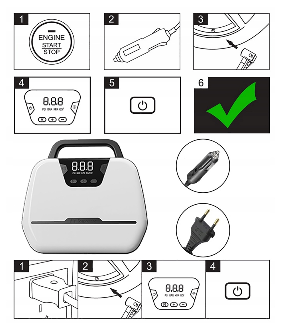 Универсальный, удобный компрессор, который может питаться как от розетки прикуривателя 12 В, так и от сети 230 В. Благодаря этому вы можете использовать компрессор практически где угодно – в машине, дома и... везде, где есть электричество!