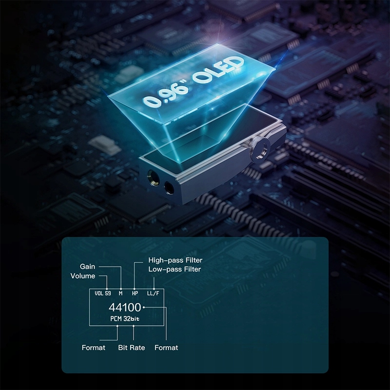 iBasso DC07PRO оснащен 0,96-дюймовым OLED-экраном и многофункциональной ручкой с потенциометром ALPS, облегчающей работу ЦАП/AMP. На дисплее отображается информация об уровне громкости, усилении, выбранном цифровом фильтре, формате воспроизводимого файла и частоте его дискретизации. Ручка используется не только для изменения громкости, но и позволяет заходить в настройки и управлять отдельными функциями.