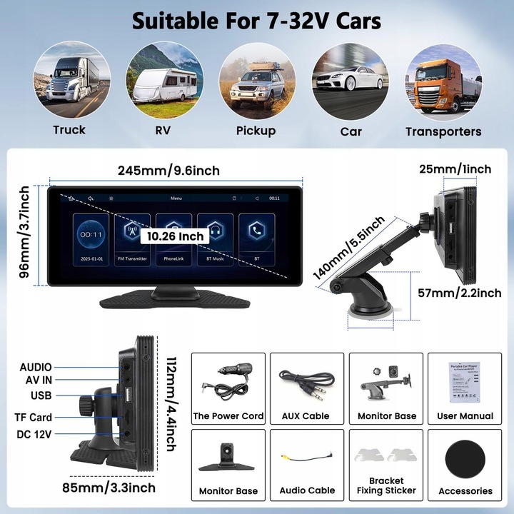 10,26-дюймовая портативная стерео-карбовая система с регулируемым 360 ° Угол зрения: 10,26-дюймовый портативный автомобильный экран Android Carplay с регулируемым ручкой обеспечивает лучшие визуальные эффекты, поддерживает регулируемый угол просмотра на 360 °, вы можете выбрать правильную перспективу. Экран Apple CarPlay похож на пробку и игру, простой в установке.