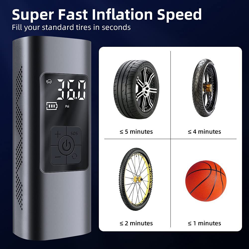 Наш портативный насос для шин оснащен литиевой батареей емкостью 6000 мАч. После полной зарядки он может одновременно накачивать шины четырех легковых автомобилей. Максимальное давление 150 PSI и большой встроенный аккумулятор емкостью 6000 мАч гарантируют, что вы сможете легко накачать все шины и мячи в вашем автомобиле/велосипеде/мотоцикле всего за несколько минут. Если во время путешествия у вас разрядился аккумулятор, не волнуйтесь. В комплект входит шнур питания длиной 9,8 фута с автомобильным адаптером на 12 В, обеспечивающий достаточное расстояние, чтобы легко накачивать шины спереди назад. (Внимание: для зарядки через USB-кабель требуется адаптер 5 В, 2 А или больше)