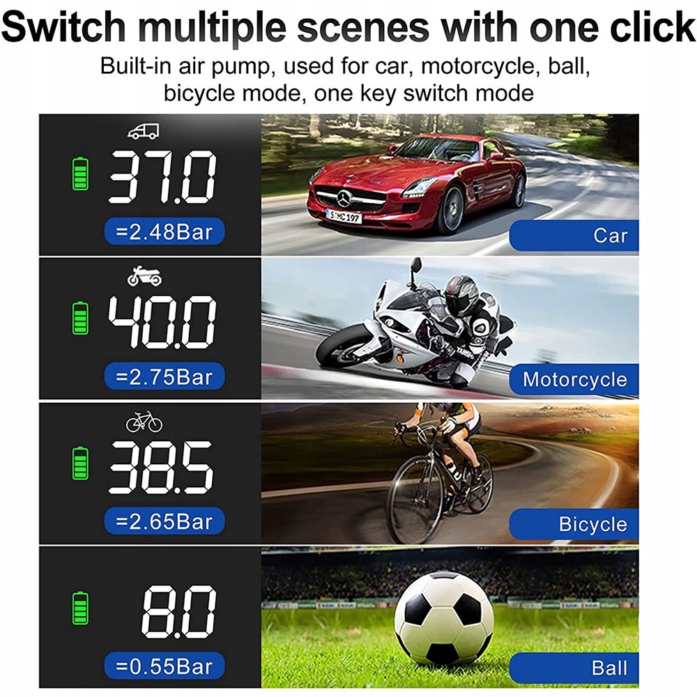 Наш электронасос оснащен набором из четырех многофункциональных насадок. Более широкий спектр применения охватывает разнообразные потребности в надувных изделиях, таких как автомобильные шины, спортивное и развлекательное оборудование, включая компактные и средние автомобили, велосипеды, мотоциклы, подушки безопасности и лодки. надувные лодки и мячи. Этот небольшой воздушный компрессор идеально подходит для использования дома и на открытом воздухе.