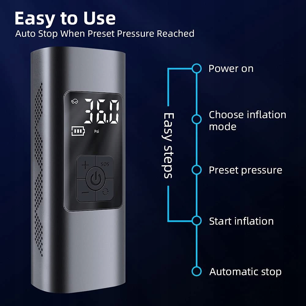 Беспроводные насосы для матрасов с большим цифровым ЖК-дисплеем, на котором можно легко проверить значение давления. Интеллектуальный компрессор для шин имеет 4 дополнительных единицы измерения, включая фунты на квадратный дюйм, бар, кПа, кг/см. Вы можете установить соответствующую единицу, отрегулировав ключ в соответствии с вашими потребностями. Благодаря функции настройки давления насос для накачивания шин автоматически накачивает необходимое количество воздуха и автоматически прекращает накачивание, когда давление в шинах достигает заданного значения, обеспечивая быструю, точную и безопасную накачку.