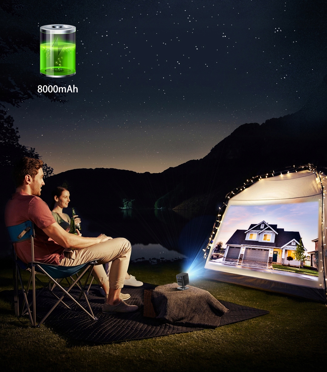 - as a portable projector for work, for camping, for a barbecue, to events,