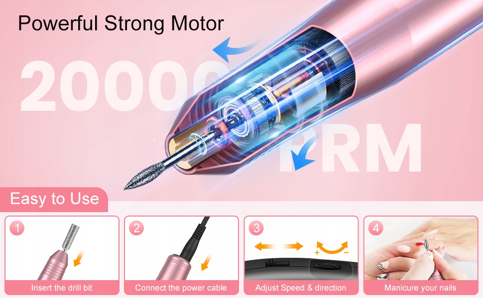 Электрическая тренировка для ногтей оснащена мощным, но тихим двигателем с интеллектуальным рассеянием тепла, электрический файл ногтей может помочь пескоть и удалить гель плавкий и быстрее. Низкий шум, низкая температура и низкие вибрации во время использования обеспечивают комфорт при маникюре.