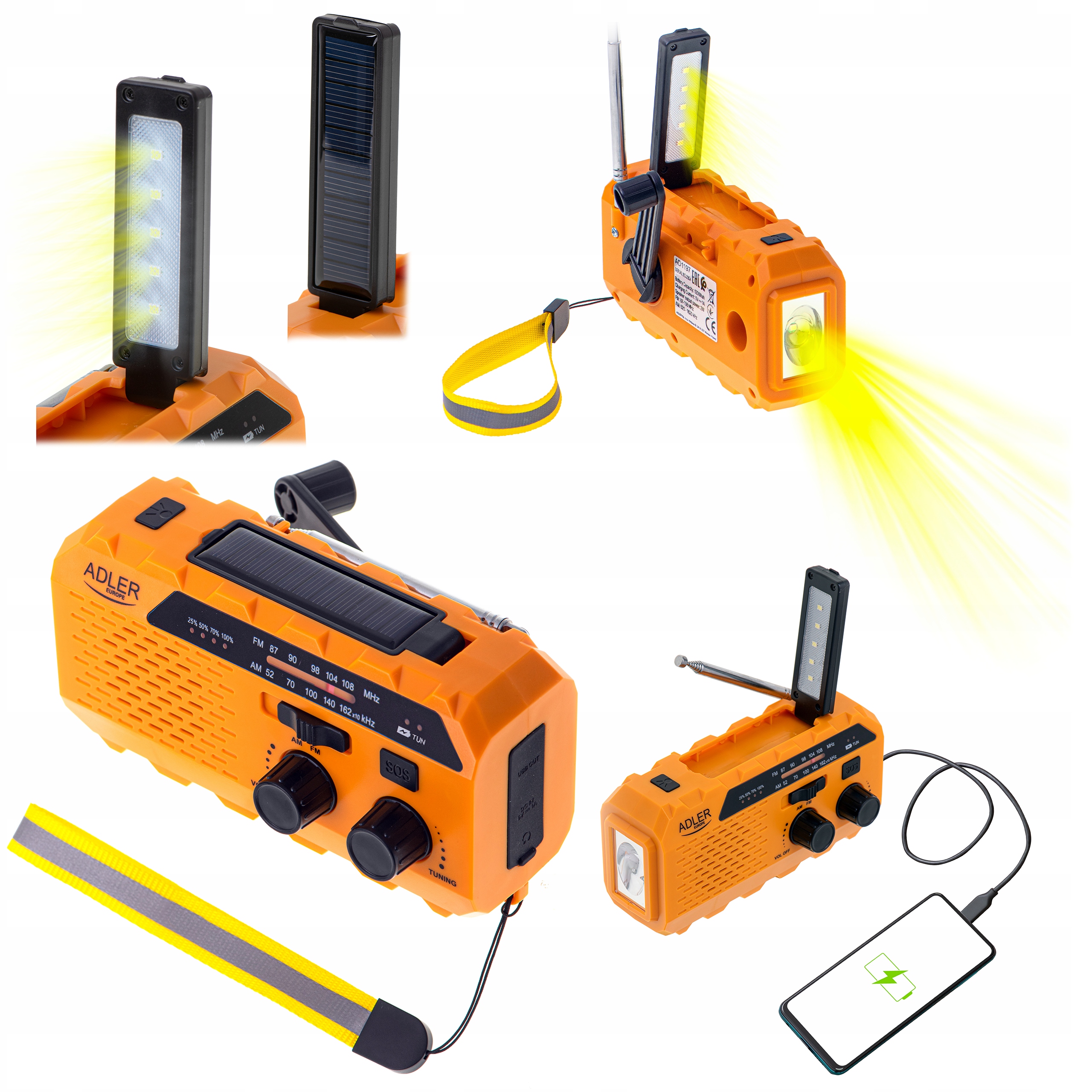 🔹 Устройство может быть накормлено встроенной батареей, солнечной энергией (солнечная панель) или вручную от динамо.