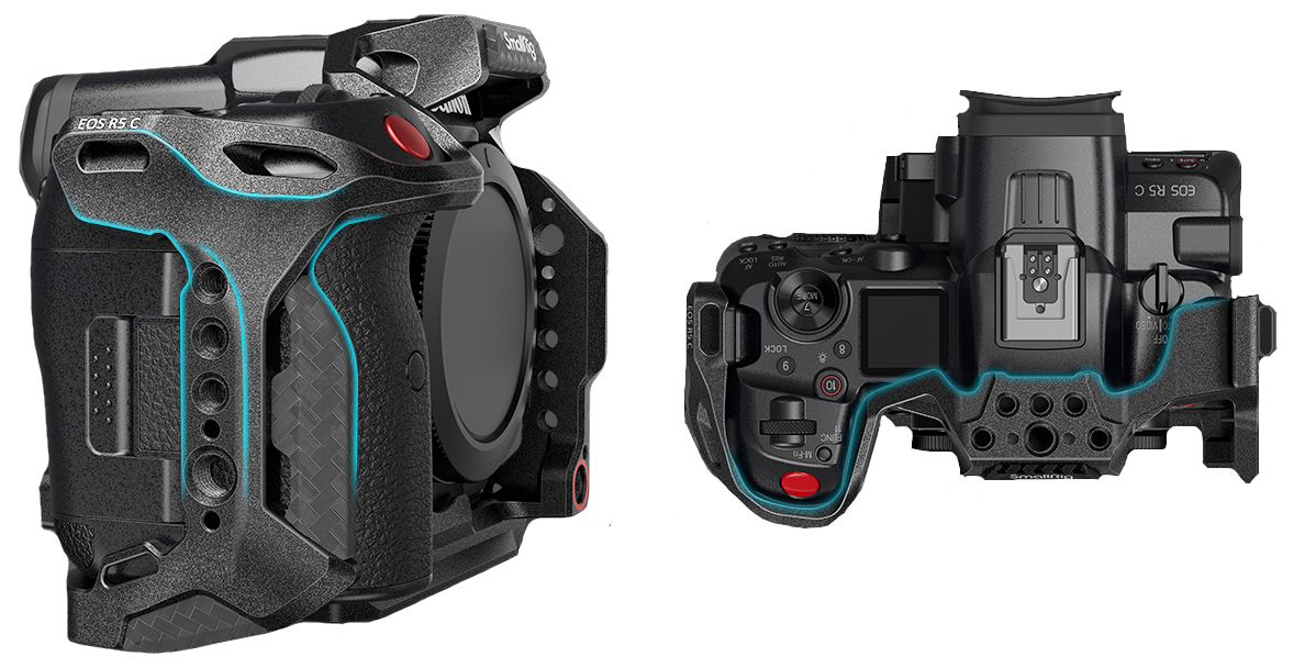 Клетка для камеры специальной формы с четким контуром вокруг рукоятки в сочетании с ручкой для верхней руки. Этот оригинальный дизайн предоставляет полный доступ к элементам управления.