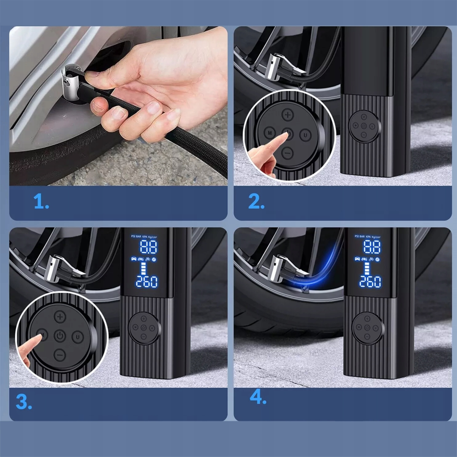 - ☑️【МНОГОФУНКЦИОНАЛЬНАЯ АВТОМАТИЧЕСКАЯ НАДУВКА】Просто установите необходимое давление ( 4 единицы на выбор: фунты на квадратный дюйм, бар, кПа, кг/см²), и когда значение давления воздуха будет достигнуто, воздушный насос автоматически прекратит накачивание, чтобы избежать чрезмерного накачивания. Максимальное давление в шинах составляет 150 фунтов на квадратный дюйм/10 бар.