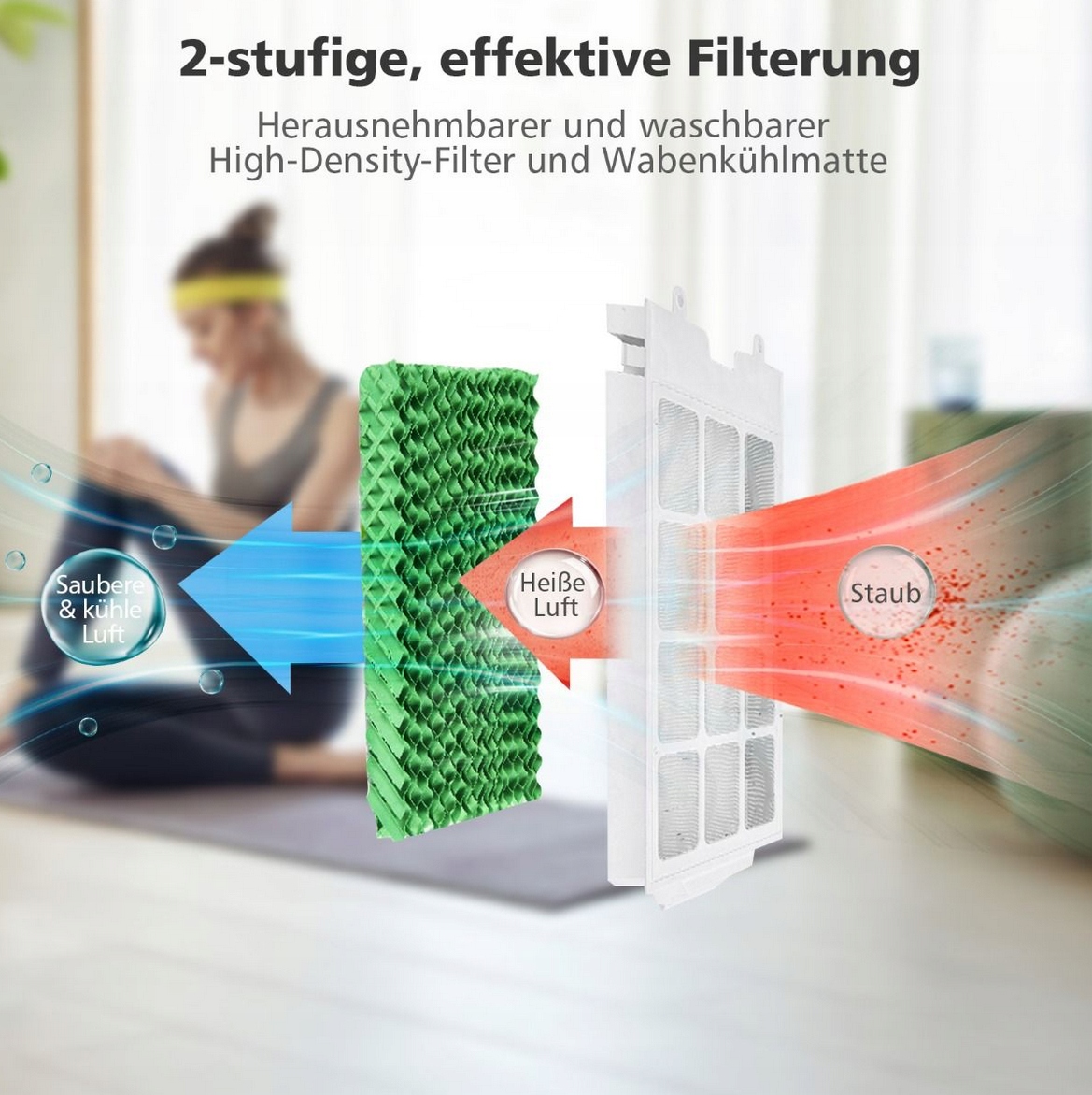Компактный и портативный воздухоохладитель: размеры испарительного вентилятора составляют 37 x 32 x 74,5 см, что идеально подходит для помещений с ограниченным пространством. Встроенная ручка и плавно вращающиеся колеса позволяют легко перемещать вентилятор в любое место, например, в гостиную, спальню или офис.