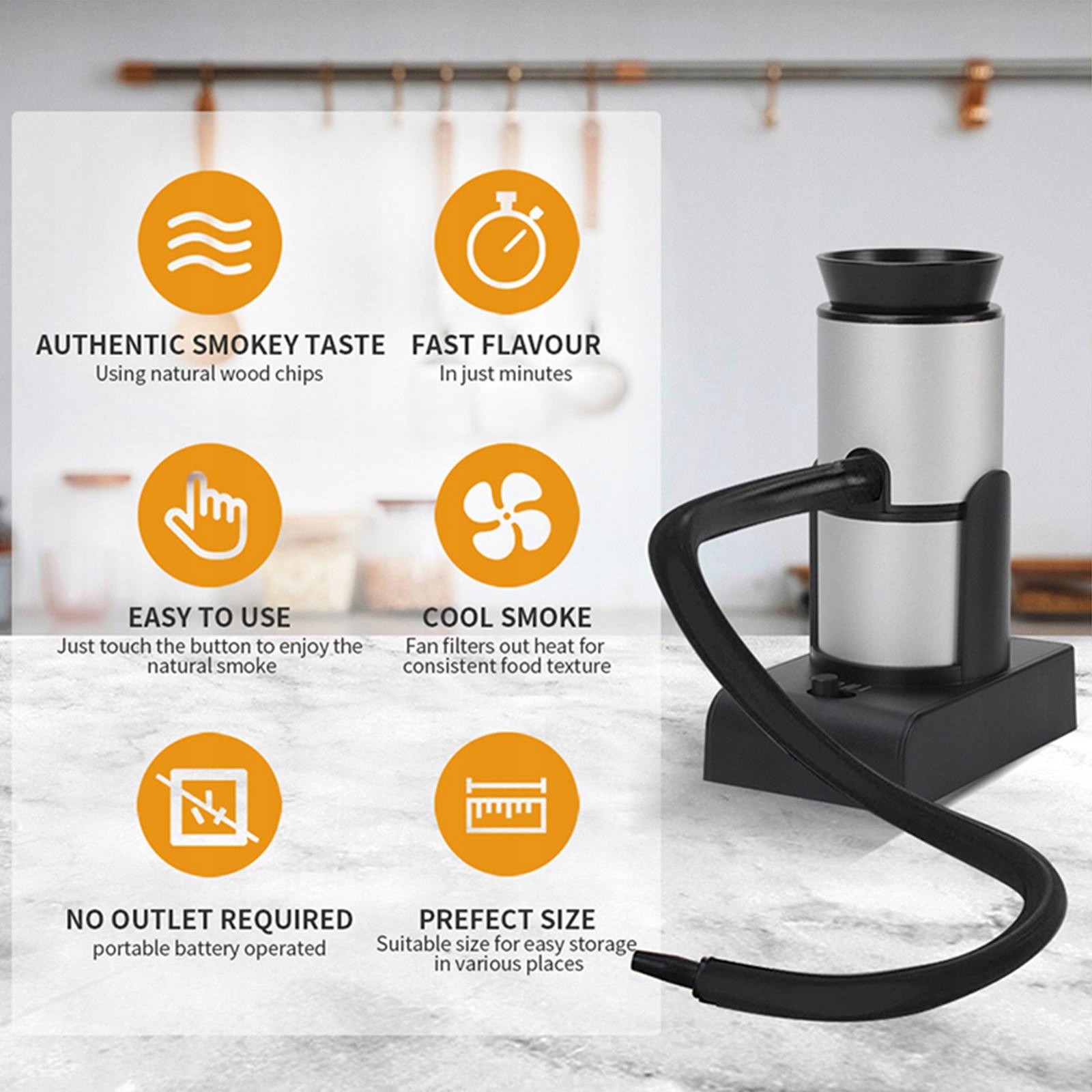 Придайте дымный аромат вашей еде или напитку за считанные минуты, прокоптите еду или напиток в кратчайшие сроки. Этот прибор для заварки дыма придаст вашей еде/напиткам аромат дыма, который не изменит текстуру или температуру вашей еды/напитков.